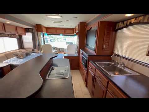 Allison 6-speed transmission, Onan 5.5W generator w/ 445 hours, 50amp services, electric & propane & refrigerator and 10 gallon water heater, auxiliary fuel pump, central vacuum, 8 seat belts, 1 inflatable queen w/ 1 folding sofa bed in the front and 2 queen bunks in the back.