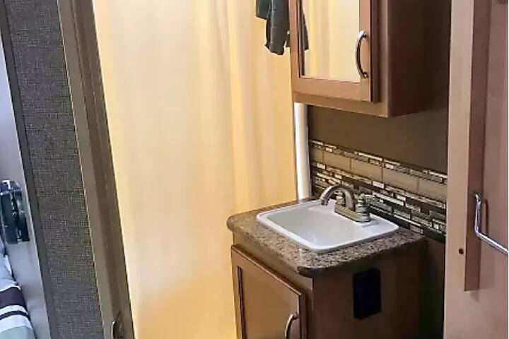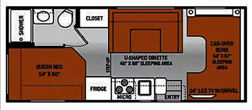MASTER BEDROOM: Queen sized bedMISC SLEEPING: Roomy overhead bunk is available. The dining table also folds into a bed.INDOOR KITCHEN: Comes with pots and pans, coffee pot, toaster, dishes, utensils, knives, plates, bowls, scrub brush, broom, and mop. Also comes with microwave and stove top/oven.ENTERTAINMENT: Comes equipped with TV and radio.YOU PROVIDE: linens(sheets, blankets, pillows) and towels.Generator fees: 2 hours free per night $5.50 per hour for overagesWHY RENT WITH US?Support Private parties can’t offer that. We have RV techs on standby to help.This Is Our Job!! We manage the campers on our site for families. We have a full staff dedicated to making sure your get away is flawless.Top Notch Choices We only rent out campers in pristine condition and have detailed inspections after each rental.Your Trip Is Protected If you rent directly from a private owner with one camper and that camper gets damaged by a previous renter or the owner decides they want to use or sell, you may end up with no camper and little time to find a replacement. IT HAPPENS!!