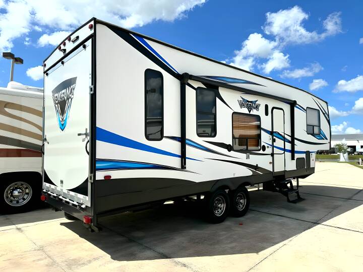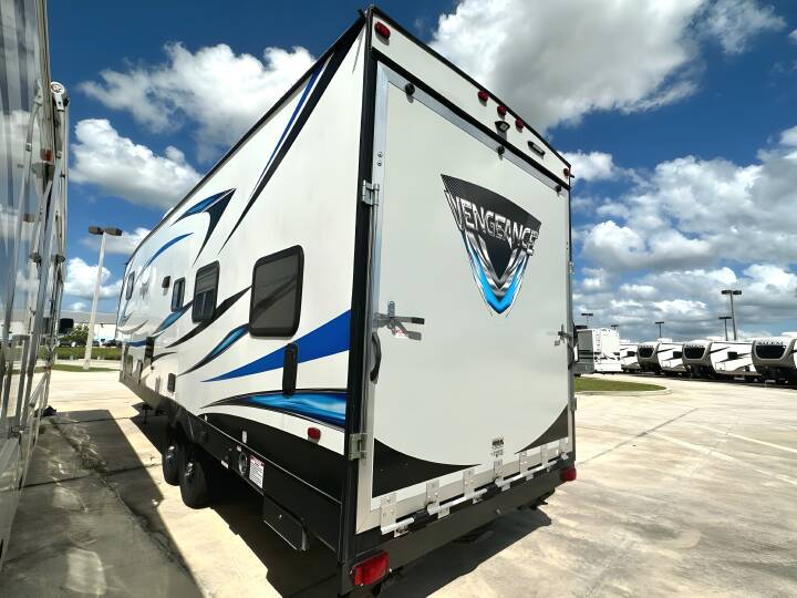 2018 VENGEANCE ROGUE, 295A18, Fifth Wheel TH, Air Conditioning (BTUs) (13500),Air Conditioning (Standard),Air Conditioning Prewiring (Yes),Air Conditioning Type (Automatic),Awning (Standard),Awning Length (ft) (21),Awning Length (m) (6.4),Bathroom (Standard),Bathroom Flooring Type (Vinyl),Bathroom Location (Center),Bathroom Medicine Cabinet (Standard),Bathroom Medicine Cabinet Location (Center),Bathroom Mirror (Standard),Bathroom Mirror Location (Center),Bathroom Sink (Standard),Bathroom Sink Location (Center),Bathroom Vent / Fan System (Standard),Bathroom Vent / Fan System Location (Center),Battery Cover (Standard),Battery (Standard),Battery Converter Amps (55),Battery Power Converter (Yes),Bed Spreads (Standard),Beds (Standard),Black Water Holding Tank Gauge (Standard),Body Material (Wood),Brakes (Standard),CD Player (Standard),Cable Prewiring (Yes),Carbon Monoxide Detector (Standard),Construction (Standard),Curtains / Shades (Standard),DVD Player (Standard),Door Type (Curtain),Doors (Standard),Emergency Exit(s) (Standard),Exterior Entertainment System (Standard),Exterior Flood Lights (Standard),Exterior Patio / Deck (Standard),Exterior Patio / Deck Location (Rear),Exterior Plugs (Standard),Exterior Shower (Standard),Freeze Proof Insulation (Optional),Fresh Water Holding Tank Gauge (Standard),Front Brake Type (Not Applicable),Generator (Optional),Gray Water Holding Tank Gauge (Standard),Ground Fault Plugs (Standard),Heat Prewiring (Yes),Heater (BTUs) (35000),Heater (Standard),Heater Type (Automatic),Hitch Lights (Standard),Interior Decor (Standard),Interior Wood Finish (Yes),Kitchen / Living Area (Standard),Kitchen / Living Area Flooring Type (Vinyl),Kitchen Location (Center),Kitchen Table Configuration (Pedestal Table),Layout (Oven / Stove),Leveling Jack Type (Front Power / Rear Manual),Leveling Jacks (Standard),Living Area Location (Rear),Master Bedroom (Standard),Master Bedroom Door Style (Conventional Door),Master Bedroom Flooring Type (Carpet),Master Bedroom Location (Front),Master Bedroom Shades / Curtains (Yes),Material (Vinyl),Max Sleeping Count (8),Microwave Oven (Standard),Number Of Bathrooms (1),Number Of Convertible / Sofa Beds (1),Number Of Discs (1),Number Of Emergency Exits (1),Number Of Oven Burners (3),Number Of Queen Size Beds (1),Number Of Radios (1),Number Of Recliner / Rockers (1),Number Of Sofas (2),Number Of Televisions (1),Number of Awnings (1),Number of Doors (1),Other Electrical (Optional),Oven / Stove (Standard),Overhead Fan (Yes),Paint (Standard),Pass-Thru Storage (Standard),Power Retractable Awning (Yes),Power Vent Fan (Standard),Prewiring (Standard),Propane Alarm (Standard),Propane Tank Gauge (Standard),Radio (Standard),Rear Brake Type (Electric Drum),Recliners / Rockers (Standard),Refrigerator (Standard),Refrigerator Power Mode (Electric / Propane),Refrigerator Size (Full-Size),Retractable Roof Antenna (Standard),Roof Vents (Standard),Satellite Prewiring (Yes),Shower (Standard),Shower Location (Center),Sidewall C