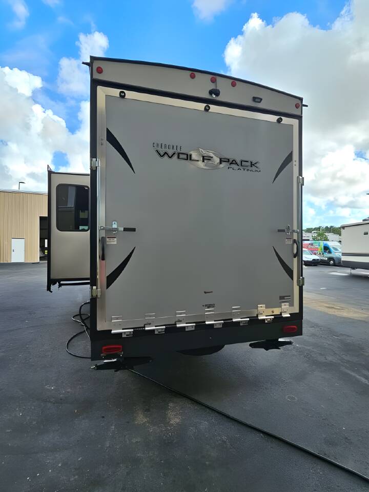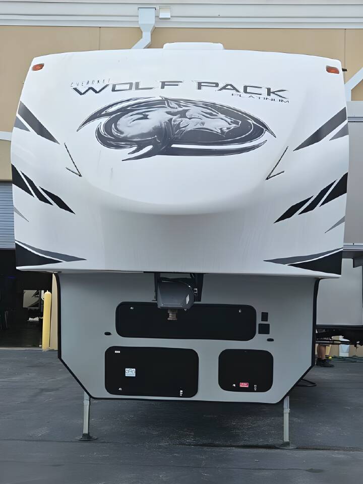 2022 CHEROKEE WOLF PACK, 310PACK10, Fifth Wheel TH, Air Conditioning (BTUs) (30000),Air Conditioning (Standard),Air Conditioning Prewiring (Prewiring) (Yes),Air Conditioning Type (Automatic),Awning (Standard),Awning Length (ft) (21),Awning Length (m) (6.4),Back-Up Camera (Prewiring) (Yes),Bathroom (Standard),Bathroom Flooring Type (Vinyl),Bathroom Location (Rear / Center),Bathroom Medicine Cabinet (Standard),Bathroom Medicine Cabinet Location (Rear / Center),Bathroom Mirror (Standard),Bathroom Mirror Location (Rear / Center),Bathroom Sink (Standard),Bathroom Sink Location (Rear / Center),Bathroom Vent / Fan System (Standard),Bathroom Vent / Fan System Location (Rear / Center),Bathtub (Standard),Bathtub Location (Rear),Battery (Standard),Battery Power Converter (Yes),Bed Spreads (Standard),Beds (Standard),Black Water Holding Tank Gauge (Standard),Bluetooth® Audio (Yes),Body Material (Aluminum),Brakes (Standard),Cable Prewiring (Prewiring) (Yes),Carbon Monoxide Detector (Standard),Construction (Standard),Curtains / Shades (Standard),Door Type (Plastic / Glass),Doors (Standard),Emergency Exit(s) (Standard),Exterior Flood Lights (Standard),Exterior Kitchen (Standard),Exterior Ladder (Standard),Exterior Patio / Deck (Standard),Exterior Patio / Deck Location (Rear),Exterior Plugs (Standard),Exterior Shower (Standard),Fireplace (Standard),Freeze Proof Insulation (Standard),Fresh Water Holding Tank Gauge (Standard),Front Brake Type (Not Applicable),Full Size Master Bedroom Closet (Yes),Generator (Optional),Gray Water Holding Tank Gauge (Standard),Ground Fault Plugs (Standard),Heat Prewiring (Prewiring) (Yes),Heater (BTUs) (35000),Heater (Standard),Heater Type (Automatic),Interior Decor (Standard),Interior Wood Finish (Yes),Kitchen / Living Area (Standard),Kitchen / Living Area Flooring Type (Carpet / Vinyl),Kitchen Location (Center),Kitchen Table Configuration (Bench Seats),Layout (Oven / Stove),Leveling Jack Type (Front Power / Rear Power),Leveling Jacks (Standard),Living Area Location (Center),Master Bedroom (Standard),Master Bedroom Door Style (Conventional Door),Master Bedroom Flooring Type (Carpet),Master Bedroom Location (Front),Master Bedroom Mirror Doors (Yes),Master Bedroom Shades / Curtains (Yes),Max Sleeping Count (10),Microwave Oven (Standard),Mobile App Instrumentation (Yes),Number Of Bathrooms (2),Number Of Convertible / Sofa Beds (2),Number Of Double Beds (2),Number Of Emergency Exits (1),Number Of King Size Beds (1),Number Of Oven Burners (3),Number Of Radios (1),Number Of Sofas (1),Number of Awnings (1),Number of Doors (1),Number of Slideouts (2),Other Exterior (Optional),Oven / Stove (Standard),Overhead Fan (Yes),Paint (Standard),Pass-Thru Storage (Standard),Power Retractable Awning (Yes),Power Retractable Slideout (Yes),Power Vent Fan (Standard),Prewiring (Prewiring) (Standard),Propane Alarm (Standard),Propane Tank Gauge (Standard),Radio (Standard),Rear Brake Type (Electric Drum),Rear Video Backup Camera (Standard),Recliners / Rockers