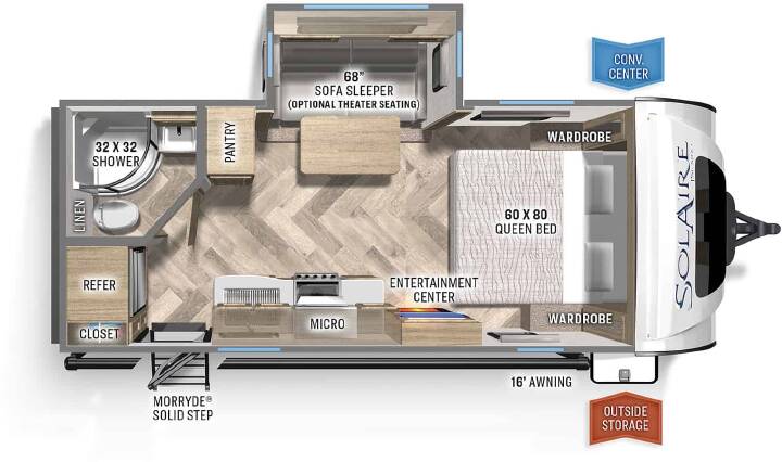2022 Palomino Solaire 208SS, Other Specifications:THEATER SEATING 68"FIREPLACEAIR CONDITIONER - 15K BTU24" TVGLASS TOP FLUSH MOUNT RANGEMAXX AIR VENTVALUE PACKAGE