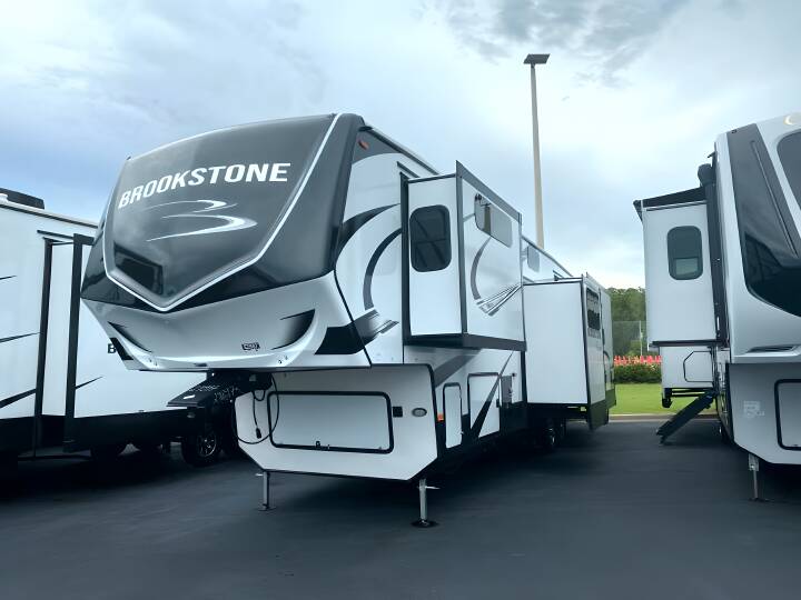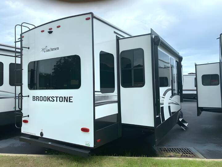2023 COACHMEN BROOKSTONE, 398MBS, Fifth Wheel, Air Conditioning (BTUs) (28500),Air Conditioning (Standard),Air Conditioning Prewiring (Yes),Air Conditioning Type (Automatic),Awning (Standard),Awning Length (ft) (20),Awning Length (m) (6.1),Back-Up Camera (Yes),Bathroom (Standard),Bathroom Flooring Type (Vinyl),Bathroom Location (Center),Bathroom Medicine Cabinet (Standard),Bathroom Medicine Cabinet Location (Center),Bathroom Mirror (Standard),Bathroom Mirror Location (Center),Bathroom Sink (Standard),Bathroom Sink Location (Center),Bathroom Vent / Fan System (Standard),Bathroom Vent / Fan System Location (Center),Battery (Standard),Battery Power Converter (Yes),Bed Spreads (Standard),Beds (Standard),Black Water Holding Tank Gauge (Standard),Bluetooth® Audio (Yes),Body Material (Aluminum),Brakes (Standard),Bunkhouse (Yes),CD Player (Standard),Cable Prewiring (Yes),Carbon Monoxide Detector (Standard),Ceiling Fan (Standard),Construction (Standard),Curtains / Shades (Standard),DVD Player (Standard),Door Type (Plastic / Glass),Doors (Standard),Emergency Exit(s) (Standard),Exterior Flood Lights (Standard),Exterior Ladder (Standard),Exterior Plugs (Standard),Exterior Shower (Standard),Fireplace (Standard),Freeze Proof Insulation (Standard),Fresh Water Holding Tank Gauge (Standard),Front Brake Type (Not Applicable),Full Size Master Bedroom Closet (Yes),Generator (Optional),Gray Water Holding Tank Gauge (Standard),Ground Fault Plugs (Standard),Heat Prewiring (Yes),Heater (BTUs) (40000),Heater (Standard),Heater Type (Automatic),Interior Decor (Standard),Interior Wood Finish (Yes),Kitchen / Living Area (Standard),Kitchen / Living Area Flooring Type (Carpet / Vinyl),Kitchen Location (Center),Kitchen Table Configuration (Chairs),Layout (Oven / Stove),Leveling Jack Type (Front Power / Rear Power),Leveling Jacks (Standard),Living Area Location (Rear),Master Bedroom (Standard),Master Bedroom Door Style (Conventional Door),Master Bedroom Flooring Type (Vinyl),Master Bedroom Location (Front / Center),Master Bedroom Mirror Doors (Yes),Master Bedroom Shades / Curtains (Yes),Material (Leather),Max Sleeping Count (9),Microwave Oven (Standard),Number Of Bathrooms (1),Number Of Bunk Beds (1),Number Of Convertible / Sofa Beds (2),Number Of Discs (1),Number Of Emergency Exits (1),Number Of Oven Burners (3),Number Of Queen Size Beds (1),Number Of Radios (1),Number Of Recliner / Rockers (2),Number Of Sofas (2),Number Of Televisions (1),Number of Awnings (1),Number of Doors (1),Number of Slideouts (4),Oven / Stove (Standard),Oven Depth (in) (21),Oven Depth (mm) (533.4),Overhead Fan (Yes),Paint (Standard),Pass-Thru Storage (Standard),Power Retractable Awning (Yes),Power Retractable Slideout (Yes),Power Vent Fan (Standard),Prewiring (Standard),Propane Alarm (Standard),Radio (Standard),Rear Brake Type (Electric Drum),Rear Bumper Drain Hose Carrier (Standard),Rear Hitch (Optional),Recliners / Rockers (Standard),Refrigerator (Standard),Refrigerator Power Mode (Electric),Refriger