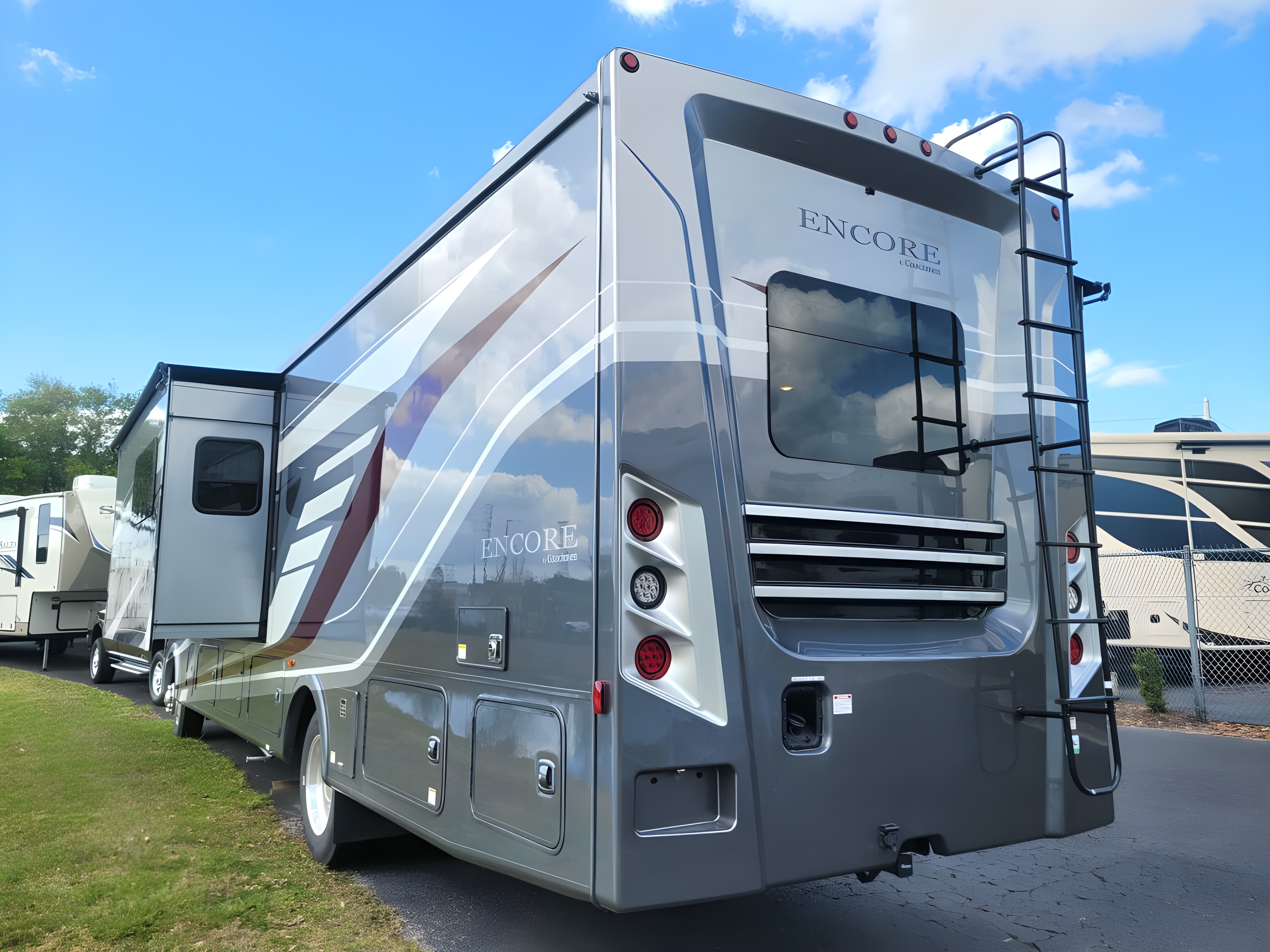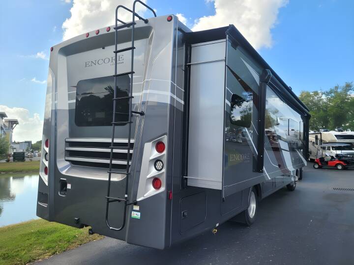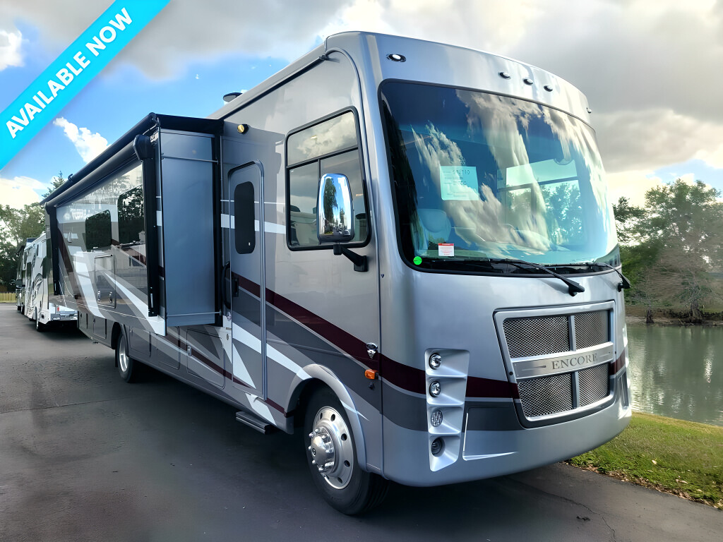 2023 COACHMEN Encore, 355DS, Class A Gas, Air Conditioning (BTUs) (30000),Air Conditioning (Standard),Air Conditioning Prewiring (Prewiring) (Yes),Air Conditioning Type (Automatic),Anti-Lock Brakes (Standard),Awning (Standard),Awning Length (ft) (20),Awning Length (m) (6.1),Back-Up Camera (Prewiring) (Yes),Bathroom (Standard),Bathroom Flooring Type (Vinyl),Bathroom Location (Center),Bathroom Medicine Cabinet (Standard),Bathroom Medicine Cabinet Location (Center),Bathroom Mirror (Standard),Bathroom Mirror Location (Center),Bathroom Sink (Standard),Bathroom Sink Location (Center),Bathroom Vent / Fan System (Standard),Bathroom Vent / Fan System Location (Center),Battery (Standard),Battery Converter Amps (55),Battery Power Converter (Yes),Bed Spreads (Standard),Beds (Standard),Black Water Holding Tank Gauge (Standard),Bluetooth® Audio (Yes),Body Material (Aluminum),Brakes (Standard),Cable Prewiring (Prewiring) (Yes),Carbon Monoxide Detector (Standard),Carburetion (Standard),Carburetion Type (Fuel Injected),Chassis Brand (Ford),Chassis Model (F53),Construction (Standard),Cruise Control (Standard),Curtains / Shades (Standard),Cylinders (8),Displacement (l) (7.3),Door Type (Plastic / Glass),Doors (Standard),Emergency Exit(s) (Standard),Engine (Standard),Engine Type (V8),Exterior Entertainment System (Standard),Exterior Flood Lights (Standard),Exterior Ladder (Standard),Exterior Plugs (Standard),Fresh Water Holding Tank Gauge (Standard),Front Brake Type (Hydraulic Disc),Front Windshield Shade (Standard),Fuel Requirements (Regular),Fuel Type (Gas),Full Size Master Bedroom Closet (Yes),GPS (Standard),Generator (Standard),Gray Water Holding Tank Gauge (Standard),Ground Fault Plugs (Standard),Heat Prewiring (Prewiring) (Yes),Heater (BTUs) (35000),Heater (Standard),Heater Type (Automatic),Horsepower (bhp) (350),Horsepower (kW) (261.2),Horsepower RPM (3900),Interior Decor (Standard),Interior Wood Finish (Yes),Kitchen / Living Area (Standard),Kitchen / Living Area Flooring Type (Vinyl),Kitchen Location (Center),Kitchen Table Configuration (Bench Seats),Layout (Oven / Stove),Leveling Jack Type (Front Power / Rear Power),Leveling Jacks (Standard),Living Area Location (Front),Master Bedroom (Standard),Master Bedroom Door Style (Full Sliding Door),Master Bedroom Flooring Type (Vinyl),Master Bedroom Location (Rear),Master Bedroom Mirror Doors (Yes),Master Bedroom Shades / Curtains (Yes),Max Sleeping Count (8),Microwave Oven (Standard),Mobile App Instrumentation (Yes),Number Of Bathrooms (1),Number Of Convertible / Sofa Beds (2),Number Of Double Beds (1),Number Of Emergency Exits (1),Number Of King Size Beds (1),Number Of Oven Burners (3),Number Of Radios (1),Number Of Rows (1),Number Of Seats (2),Number Of Sofas (1),Number Of Speeds (6),Number Of Televisions (3),Number of Awnings (1),Number of Doors (1),Number of Slideouts (2),Other Paint & Finish (Optional),Oven / Stove (Standard),Overdrive (Yes),Overhead Fan (Yes),Paint (Standard),Pass-Thru Storage (Standard),Pow