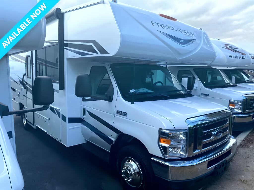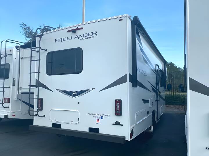 2023 COACHMEN Freelander, 26DS, Class C, Air Conditioning (BTUs) (13500),Air Conditioning (Standard),Air Conditioning Prewiring (Prewiring) (Yes),Air Conditioning Type (Automatic),Anti-Lock Brakes (Standard),Awning (Standard),Awning Length (ft) (18),Awning Length (m) (5.5),Back-Up Camera (Prewiring) (Yes),Bathroom (Standard),Bathroom Flooring Type (Vinyl),Bathroom Location (Rear),Bathroom Medicine Cabinet (Standard),Bathroom Medicine Cabinet Location (Rear),Bathroom Mirror (Standard),Bathroom Mirror Location (Rear),Bathroom Sink (Standard),Bathroom Sink Location (Rear),Bathroom Vent / Fan System (Standard),Bathroom Vent / Fan System Location (Rear),Battery (Standard),Battery Converter Amps (55),Battery Power Converter (Yes),Bed Spreads (Standard),Beds (Standard),Black Water Holding Tank Gauge (Standard),Bluetooth® Audio (Yes),Body Material (Aluminum),Brakes (Standard),Cable Prewiring (Prewiring) (Yes),Carbon Monoxide Detector (Standard),Carburetion (Standard),Carburetion Type (Fuel Injected),Chassis Brand (Ford),Chassis Model (E450),Construction (Standard),Cruise Control (Standard),Curtains / Shades (Standard),Cylinders (8),Displacement (l) (7.3),Door Type (Plastic / Glass),Doors (Standard),Emergency Exit(s) (Standard),Engine (Standard),Engine Type (V8),Exterior Entertainment System (Optional),Exterior Flood Lights (Standard),Exterior Ladder (Standard),Exterior Plugs (Standard),Exterior Shower (Standard),Freeze Proof Insulation (Standard),Fresh Water Holding Tank Gauge (Standard),Front Brake Type (Hydraulic Disc),Front Windshield Shade (Optional),Fuel Requirements (Regular),Fuel Type (Gas),Full Size Master Bedroom Closet (Yes),Generator (Standard),Gray Water Holding Tank Gauge (Standard),Ground Fault Plugs (Standard),Heat Prewiring (Prewiring) (Yes),Heater (Standard),Heater Type (Automatic),Horsepower (bhp) (300),Horsepower (kW) (223.9),Horsepower RPM (3750),Interior Decor (Standard),Interior Wood Finish (Yes),Kitchen / Living Area (Standard),Kitchen / Living Area Flooring Type (Vinyl),Kitchen Location (Center),Kitchen Table Configuration (Pedestal Table),Layout (Stove),Leveling Jack Type (Front Manual / Rear Manual),Leveling Jacks (Standard),Living Area Location (Front),Master Bedroom (Standard),Master Bedroom Door Style (Full Sliding Door),Master Bedroom Flooring Type (Vinyl),Master Bedroom Location (Rear),Master Bedroom Shades / Curtains (Yes),Max Sleeping Count (8),Microwave Oven (Standard),Number Of Bathrooms (1),Number Of Convertible / Sofa Beds (2),Number Of Emergency Exits (1),Number Of Full Size Beds (1),Number Of Oven Burners (3),Number Of Queen Size Beds (1),Number Of Radios (1),Number Of Rows (1),Number Of Seats (2),Number Of Sofas (2),Number Of Speeds (6),Number Of Televisions (1),Number of Awnings (1),Number of Doors (1),Number of Slideouts (2),Oven / Stove (Standard),Overdrive (Yes),Overhead Fan (Yes),Paint (Standard),Pass-Thru Storage (Standard),Power Retractable Awning (Yes),Power Retractable Slideout (Yes),Power Windows (Standa