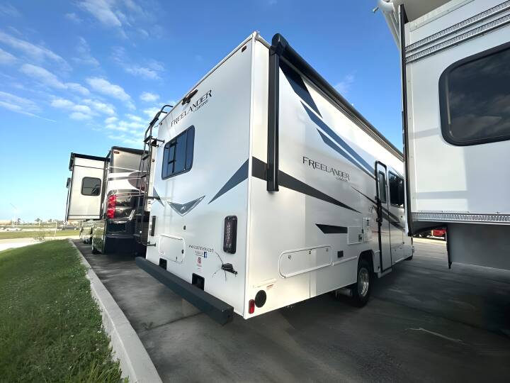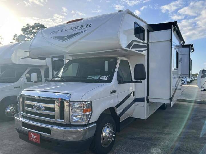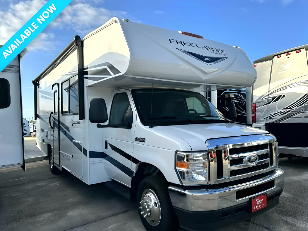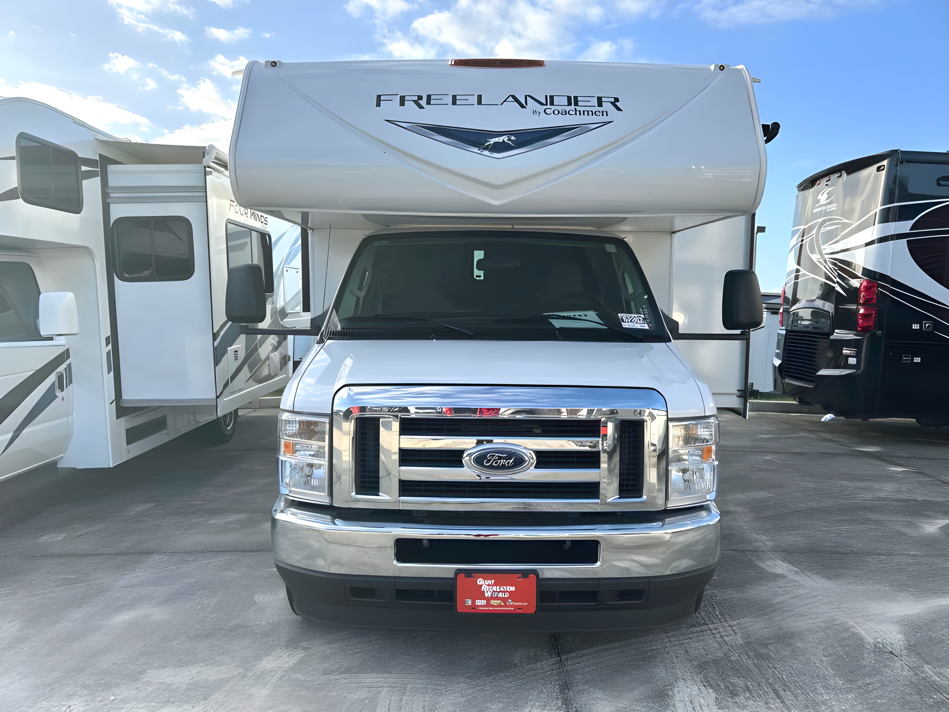 2023 COACHMEN Freelander, 26DS, Class C, Air Conditioning (BTUs) (13500),Air Conditioning (Standard),Air Conditioning Prewiring (Prewiring) (Yes),Air Conditioning Type (Automatic),Anti-Lock Brakes (Standard),Awning (Standard),Awning Length (ft) (18),Awning Length (m) (5.5),Back-Up Camera (Prewiring) (Yes),Bathroom (Standard),Bathroom Flooring Type (Vinyl),Bathroom Location (Rear),Bathroom Medicine Cabinet (Standard),Bathroom Medicine Cabinet Location (Rear),Bathroom Mirror (Standard),Bathroom Mirror Location (Rear),Bathroom Sink (Standard),Bathroom Sink Location (Rear),Bathroom Vent / Fan System (Standard),Bathroom Vent / Fan System Location (Rear),Battery (Standard),Battery Converter Amps (55),Battery Power Converter (Yes),Bed Spreads (Standard),Beds (Standard),Black Water Holding Tank Gauge (Standard),Bluetooth® Audio (Yes),Body Material (Aluminum),Brakes (Standard),Cable Prewiring (Prewiring) (Yes),Carbon Monoxide Detector (Standard),Carburetion (Standard),Carburetion Type (Fuel Injected),Chassis Brand (Ford),Chassis Model (E450),Construction (Standard),Cruise Control (Standard),Curtains / Shades (Standard),Cylinders (8),Displacement (l) (7.3),Door Type (Plastic / Glass),Doors (Standard),Emergency Exit(s) (Standard),Engine (Standard),Engine Type (V8),Exterior Entertainment System (Optional),Exterior Flood Lights (Standard),Exterior Ladder (Standard),Exterior Plugs (Standard),Exterior Shower (Standard),Freeze Proof Insulation (Standard),Fresh Water Holding Tank Gauge (Standard),Front Brake Type (Hydraulic Disc),Front Windshield Shade (Optional),Fuel Requirements (Regular),Fuel Type (Gas),Full Size Master Bedroom Closet (Yes),Generator (Standard),Gray Water Holding Tank Gauge (Standard),Ground Fault Plugs (Standard),Heat Prewiring (Prewiring) (Yes),Heater (Standard),Heater Type (Automatic),Horsepower (bhp) (300),Horsepower (kW) (223.9),Horsepower RPM (3750),Interior Decor (Standard),Interior Wood Finish (Yes),Kitchen / Living Area (Standard),Kitchen / Living Area Flooring Type (Vinyl),Kitchen Location (Center),Kitchen Table Configuration (Pedestal Table),Layout (Stove),Leveling Jack Type (Front Manual / Rear Manual),Leveling Jacks (Standard),Living Area Location (Front),Master Bedroom (Standard),Master Bedroom Door Style (Full Sliding Door),Master Bedroom Flooring Type (Vinyl),Master Bedroom Location (Rear),Master Bedroom Shades / Curtains (Yes),Max Sleeping Count (8),Microwave Oven (Standard),Number Of Bathrooms (1),Number Of Convertible / Sofa Beds (2),Number Of Emergency Exits (1),Number Of Full Size Beds (1),Number Of Oven Burners (3),Number Of Queen Size Beds (1),Number Of Radios (1),Number Of Rows (1),Number Of Seats (2),Number Of Sofas (2),Number Of Speeds (6),Number Of Televisions (1),Number of Awnings (1),Number of Doors (1),Number of Slideouts (2),Oven / Stove (Standard),Overdrive (Yes),Overhead Fan (Yes),Paint (Standard),Pass-Thru Storage (Standard),Power Retractable Awning (Yes),Power Retractable Slideout (Yes),Power Windows (Standa