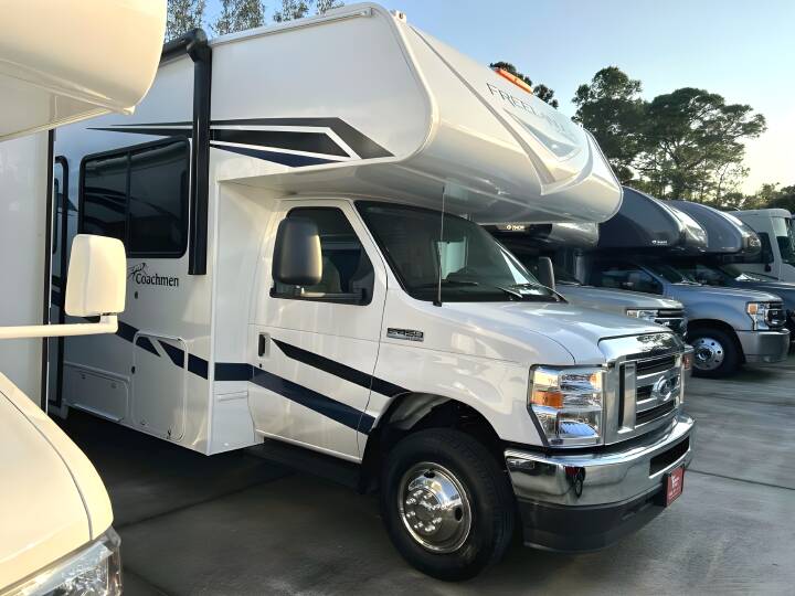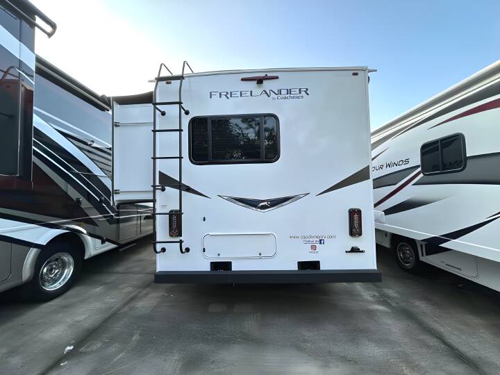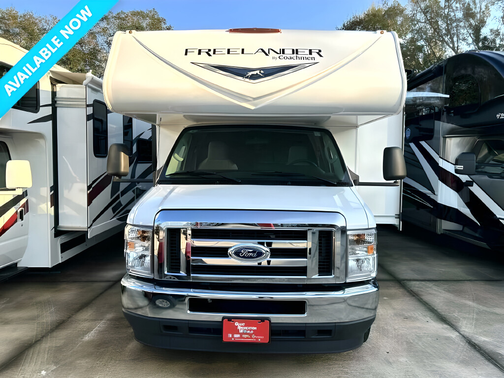 2023 COACHMEN Freelander, 26DS, Class C, Air Conditioning (BTUs) (13500),Air Conditioning (Standard),Air Conditioning Prewiring (Yes),Air Conditioning Type (Automatic),Anti-Lock Brakes (Standard),Awning (Standard),Awning Length (ft) (18),Awning Length (m) (5.5),Back-Up Camera (Yes),Bathroom (Standard),Bathroom Flooring Type (Vinyl),Bathroom Location (Rear),Bathroom Medicine Cabinet (Standard),Bathroom Medicine Cabinet Location (Rear),Bathroom Mirror (Standard),Bathroom Mirror Location (Rear),Bathroom Sink (Standard),Bathroom Sink Location (Rear),Bathroom Vent / Fan System (Standard),Bathroom Vent / Fan System Location (Rear),Battery (Standard),Battery Converter Amps (55),Battery Power Converter (Yes),Bed Spreads (Standard),Beds (Standard),Black Water Holding Tank Gauge (Standard),Bluetooth® Audio (Yes),Body Material (Aluminum),Brakes (Standard),Cable Prewiring (Yes),Carbon Monoxide Detector (Standard),Carburetion (Standard),Carburetion Type (Fuel Injected),Chassis Brand (Ford),Chassis Model (E450),Construction (Standard),Cruise Control (Standard),Curtains / Shades (Standard),Cylinders (8),Displacement (l) (7.3),Door Type (Plastic / Glass),Doors (Standard),Emergency Exit(s) (Standard),Engine (Standard),Engine Type (V8),Exterior Entertainment System (Optional),Exterior Flood Lights (Standard),Exterior Ladder (Standard),Exterior Plugs (Standard),Exterior Shower (Standard),Freeze Proof Insulation (Standard),Fresh Water Holding Tank Gauge (Standard),Front Brake Type (Hydraulic Disc),Front Windshield Shade (Optional),Fuel Requirements (Regular),Fuel Type (Gas),Full Size Master Bedroom Closet (Yes),Generator (Standard),Gray Water Holding Tank Gauge (Standard),Ground Fault Plugs (Standard),Heat Prewiring (Yes),Heater (Standard),Heater Type (Automatic),Horsepower (bhp) (300),Horsepower (kW) (223.9),Horsepower RPM (3750),Interior Decor (Standard),Interior Wood Finish (Yes),Kitchen / Living Area (Standard),Kitchen / Living Area Flooring Type (Vinyl),Kitchen Location (Center),Kitchen Table Configuration (Pedestal Table),Layout (Stove),Leveling Jack Type (Front Manual / Rear Manual),Leveling Jacks (Standard),Living Area Location (Front),Master Bedroom (Standard),Master Bedroom Door Style (Full Sliding Door),Master Bedroom Flooring Type (Vinyl),Master Bedroom Location (Rear),Master Bedroom Shades / Curtains (Yes),Max Sleeping Count (8),Microwave Oven (Standard),Number Of Bathrooms (1),Number Of Convertible / Sofa Beds (2),Number Of Emergency Exits (1),Number Of Full Size Beds (1),Number Of Oven Burners (3),Number Of Queen Size Beds (1),Number Of Radios (1),Number Of Rows (1),Number Of Seats (2),Number Of Sofas (2),Number Of Speeds (6),Number Of Televisions (1),Number of Awnings (1),Number of Doors (1),Number of Slideouts (2),Oven / Stove (Standard),Overdrive (Yes),Overhead Fan (Yes),Paint (Standard),Pass-Thru Storage (Standard),Power Retractable Awning (Yes),Power Retractable Slideout (Yes),Power Windows (Standard),Prewiring (Standard),Propane Alarm (Standard