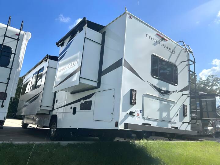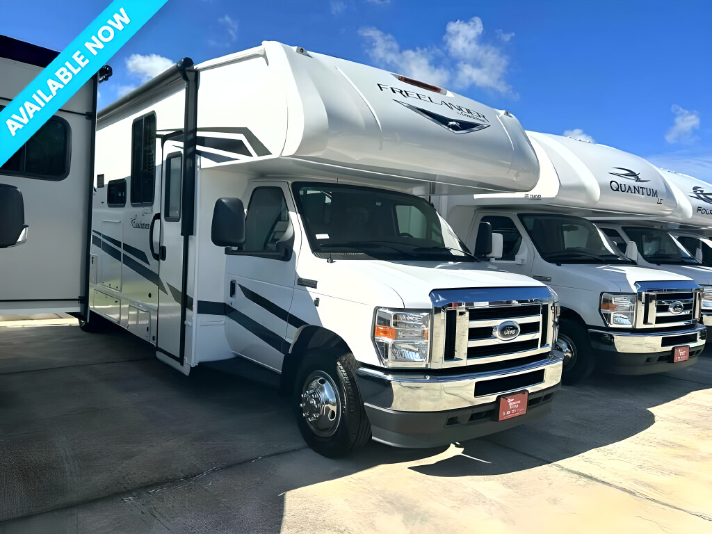 2023 COACHMEN Freelander, 31MB, Class C, Air Conditioning (BTUs) (13500),Air Conditioning (Standard),Air Conditioning Prewiring (Prewiring) (Yes),Air Conditioning Type (Automatic),Anti-Lock Brakes (Standard),Awning (Standard),Awning Length (ft) (21),Awning Length (m) (6.4),Back-Up Camera (Prewiring) (Yes),Bathroom (Standard),Bathroom Flooring Type (Vinyl),Bathroom Location (Center),Bathroom Medicine Cabinet (Standard),Bathroom Medicine Cabinet Location (Center),Bathroom Mirror (Standard),Bathroom Mirror Location (Center),Bathroom Sink (Standard),Bathroom Sink Location (Center),Bathroom Vent / Fan System (Standard),Bathroom Vent / Fan System Location (Center),Battery (Standard),Battery Converter Amps (55),Battery Power Converter (Yes),Bed Spreads (Standard),Beds (Standard),Black Water Holding Tank Gauge (Standard),Bluetooth® Audio (Yes),Body Material (Aluminum),Brakes (Standard),Cable Prewiring (Prewiring) (Yes),Carbon Monoxide Detector (Standard),Carburetion (Standard),Carburetion Type (Fuel Injected),Chassis Brand (Ford),Chassis Model (E450),Construction (Standard),Cruise Control (Standard),Curtains / Shades (Standard),Cylinders (8),Displacement (l) (7.3),Door Type (Plastic / Glass),Doors (Standard),Emergency Exit(s) (Standard),Engine (Standard),Engine Type (V8),Exterior Entertainment System (Optional),Exterior Flood Lights (Standard),Exterior Kitchen (Optional),Exterior Ladder (Standard),Exterior Plugs (Standard),Exterior Shower (Standard),Fireplace (Optional),Freeze Proof Insulation (Standard),Fresh Water Holding Tank Gauge (Standard),Front Brake Type (Hydraulic Disc),Front Windshield Shade (Optional),Fuel Requirements (Regular),Fuel Type (Gas),Full Size Master Bedroom Closet (Yes),Generator (Standard),Gray Water Holding Tank Gauge (Standard),Ground Fault Plugs (Standard),Heat Prewiring (Prewiring) (Yes),Heater (Standard),Heater Type (Automatic),Horsepower (bhp) (325),Horsepower (kW) (242.5),Horsepower RPM (3750),Interior Decor (Standard),Interior Wood Finish (Yes),Kitchen / Living Area (Standard),Kitchen / Living Area Flooring Type (Vinyl),Kitchen Location (Center),Kitchen Table Configuration (U-shaped Dinette),Layout (Stove),Leveling Jack Type (Front Manual / Rear Manual),Leveling Jacks (Standard),Living Area Location (Front),Master Bedroom (Standard),Master Bedroom Door Style (Curtain),Master Bedroom Flooring Type (Vinyl),Master Bedroom Location (Rear),Master Bedroom Mirror Doors (Yes),Master Bedroom Shades / Curtains (Yes),Max Sleeping Count (8),Microwave Oven (Standard),Number Of Bathrooms (1),Number Of Convertible / Sofa Beds (2),Number Of Emergency Exits (1),Number Of Full Size Beds (1),Number Of Oven Burners (3),Number Of Queen Size Beds (1),Number Of Radios (1),Number Of Rows (1),Number Of Seats (2),Number Of Sofas (1),Number Of Speeds (6),Number Of Televisions (1),Number of Awnings (1),Number of Doors (1),Number of Slideouts (2),Oven / Stove (Standard),Overdrive (Yes),Overhead Fan (Yes),Paint (Standard),Pass-Thru Storage (Standard),