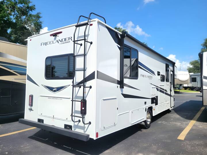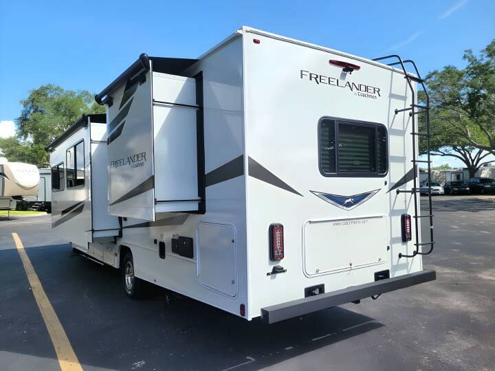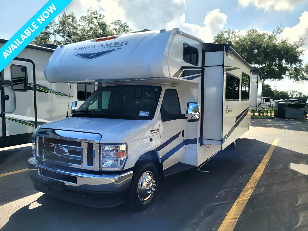 2023 COACHMEN Freelander, 31MB, Class C, Air Conditioning (BTUs) (13500),Air Conditioning (Standard),Air Conditioning Prewiring (Prewiring) (Yes),Air Conditioning Type (Automatic),Anti-Lock Brakes (Standard),Awning (Standard),Awning Length (ft) (21),Awning Length (m) (6.4),Back-Up Camera (Prewiring) (Yes),Bathroom (Standard),Bathroom Flooring Type (Vinyl),Bathroom Location (Center),Bathroom Medicine Cabinet (Standard),Bathroom Medicine Cabinet Location (Center),Bathroom Mirror (Standard),Bathroom Mirror Location (Center),Bathroom Sink (Standard),Bathroom Sink Location (Center),Bathroom Vent / Fan System (Standard),Bathroom Vent / Fan System Location (Center),Battery (Standard),Battery Converter Amps (55),Battery Power Converter (Yes),Bed Spreads (Standard),Beds (Standard),Black Water Holding Tank Gauge (Standard),Bluetooth® Audio (Yes),Body Material (Aluminum),Brakes (Standard),Cable Prewiring (Prewiring) (Yes),Carbon Monoxide Detector (Standard),Carburetion (Standard),Carburetion Type (Fuel Injected),Chassis Brand (Ford),Chassis Model (E450),Construction (Standard),Cruise Control (Standard),Curtains / Shades (Standard),Cylinders (8),Displacement (l) (7.3),Door Type (Plastic / Glass),Doors (Standard),Emergency Exit(s) (Standard),Engine (Standard),Engine Type (V8),Exterior Entertainment System (Optional),Exterior Flood Lights (Standard),Exterior Kitchen (Optional),Exterior Ladder (Standard),Exterior Plugs (Standard),Exterior Shower (Standard),Fireplace (Optional),Freeze Proof Insulation (Standard),Fresh Water Holding Tank Gauge (Standard),Front Brake Type (Hydraulic Disc),Front Windshield Shade (Optional),Fuel Requirements (Regular),Fuel Type (Gas),Full Size Master Bedroom Closet (Yes),Generator (Standard),Gray Water Holding Tank Gauge (Standard),Ground Fault Plugs (Standard),Heat Prewiring (Prewiring) (Yes),Heater (Standard),Heater Type (Automatic),Horsepower (bhp) (325),Horsepower (kW) (242.5),Horsepower RPM (3750),Interior Decor (Standard),Interior Wood Finish (Yes),Kitchen / Living Area (Standard),Kitchen / Living Area Flooring Type (Vinyl),Kitchen Location (Center),Kitchen Table Configuration (U-shaped Dinette),Layout (Stove),Leveling Jack Type (Front Manual / Rear Manual),Leveling Jacks (Standard),Living Area Location (Front),Master Bedroom (Standard),Master Bedroom Door Style (Curtain),Master Bedroom Flooring Type (Vinyl),Master Bedroom Location (Rear),Master Bedroom Mirror Doors (Yes),Master Bedroom Shades / Curtains (Yes),Max Sleeping Count (8),Microwave Oven (Standard),Number Of Bathrooms (1),Number Of Convertible / Sofa Beds (2),Number Of Emergency Exits (1),Number Of Full Size Beds (1),Number Of Oven Burners (3),Number Of Queen Size Beds (1),Number Of Radios (1),Number Of Rows (1),Number Of Seats (2),Number Of Sofas (1),Number Of Speeds (6),Number Of Televisions (1),Number of Awnings (1),Number of Doors (1),Number of Slideouts (2),Oven / Stove (Standard),Overdrive (Yes),Overhead Fan (Yes),Paint (Standard),Pass-Thru Storage (Standard),