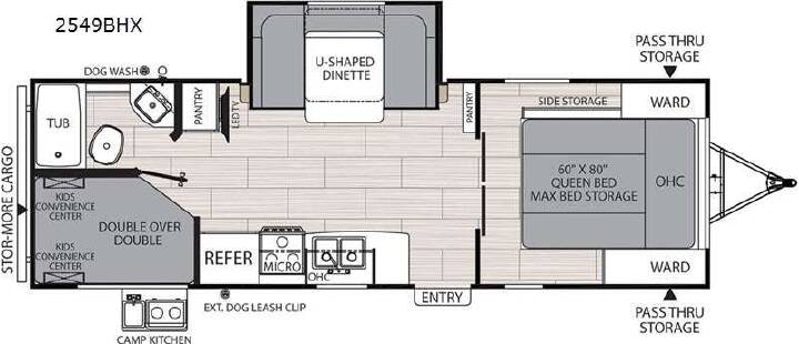This family-friendly spacious trailer offers the kids their own double size bunks with kids convenience centers, and there is a Stor-More cargo door to use to stow items as you travel to your favorite campgrounds. Of course, the rear corner bath will come in handy to clean up before bedtime, and the exterior dog wash will keep your family pet clean. You will have your own privacy in the front bedroom with a queen bed that includes the MAX BED storage feature. When you are outside you might like to make a few meals using the exterior camp kitchen and relax under the power awning, plus stow a few things in the pass-through compartment with motion activated light like fishing poles, tackle, charcoal and such. Each Spirit XTR travel trailer by Coachmen is constructed with a laminated, aluminum framed floor, sidewalls and rear wall, plus Azdel composite panels in place of Luaun plywood, and a Tufflex PVC roof membrane to provide a lightweight, sturdy and easy to tow trailer by a smaller tow vehicle. The interior includes lumber core cabinets stiles, mortis and tenon cabinet doors, and seamless thermo foil wrapped countertops for easy care. You will also find the MAX BED storage feature which offers a walk-through area under the bed with drawers, extra storage for pillows, blankets and shoes, plus a padded seat allowing you to easily put on your shoes each morning. A few more features you are sure to appreciate include a wireless phone charger, motion activated floor lights, a battery disconnect switch and a digital level. For more information on this new arrival, email sales@crossroadstrailers.com or call us at 800-545-4497