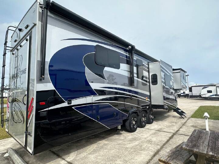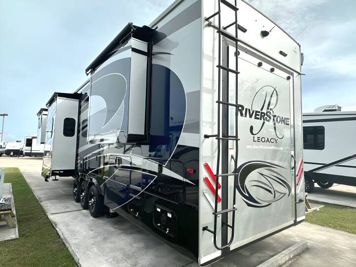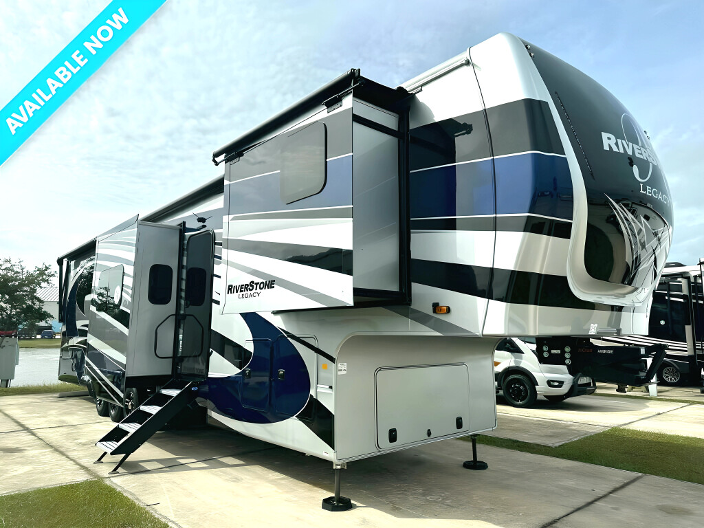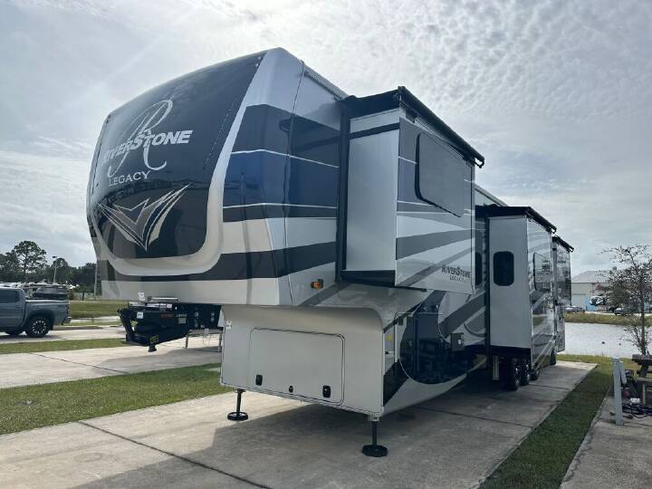 2023 RIVERSTONE RIVERSTONE LEGACY, 42FSKG, Fifth Wheel TH, Air Conditioning (BTUs) (30000),Air Conditioning (Standard),Air Conditioning Prewiring (Prewiring) (Yes),Air Conditioning Type (Automatic),Awning (Standard),Awning Length (ft) (29.5),Awning Length (m) (9),Back-Up Camera (Prewiring) (Yes),Bathroom (Standard),Bathroom Flooring Type (Vinyl),Bathroom Location (Center),Bathroom Medicine Cabinet (Standard),Bathroom Medicine Cabinet Location (Center),Bathroom Mirror (Standard),Bathroom Mirror Location (Center),Bathroom Sink (Standard),Bathroom Sink Location (Center),Bathroom Vent / Fan System (Standard),Bathroom Vent / Fan System Location (Center),Battery (Standard),Battery Power Converter (Yes),Bed Spreads (Standard),Beds (Standard),Black Water Holding Tank Gauge (Standard),Bluetooth® Audio (Yes),Body Material (Aluminum),Brakes (Standard),Brand Name (JBL),CD Player (Standard),Cable Prewiring (Prewiring) (Yes),Carbon Monoxide Detector (Standard),Ceiling Fan (Standard),Central Vacuum System (Standard),Construction (Standard),Curtains / Shades (Standard),DVD Player (Standard),Dishwasher (Standard),Door Type (Plastic / Glass),Doors (Standard),Emergency Exit(s) (Standard),Exterior Entertainment System (Optional),Exterior Flood Lights (Standard),Exterior Ladder (Standard),Exterior Plugs (Standard),Exterior Shower (Standard),Fireplace (Standard),Freeze Proof Insulation (Standard),Fresh Water Holding Tank Gauge (Standard),Front Brake Type (Not Applicable),Full Size Master Bedroom Closet (Yes),Generator (Optional),Gray Water Holding Tank Gauge (Standard),Ground Fault Plugs (Standard),Heat Prewiring (Prewiring) (Yes),Heater (BTUs) (40000),Heater (Standard),Heater Type (Automatic),Interior Decor (Standard),Interior Wood Finish (Yes),Kitchen / Living Area (Standard),Kitchen / Living Area Flooring Type (Carpet / Vinyl),Kitchen Location (Front),Kitchen Table Configuration (Counter / Island),Layout (Oven / Stove),Leveling Jack Type (Front Power / Rear Power),Leveling Jacks (Standard),Living Area Location (Center),Master Bedroom (Standard),Master Bedroom Door Style (Conventional Door),Master Bedroom Flooring Type (Vinyl),Master Bedroom Location (Rear),Master Bedroom Shades / Curtains (Yes),Material (Cloth),Max Sleeping Count (6),Microwave Oven (Standard),Mobile App Instrumentation (Yes),Number Of Bathrooms (1),Number Of Convertible / Sofa Beds (1),Number Of Discs (1),Number Of Emergency Exits (1),Number Of Oven Burners (4),Number Of Queen Size Beds (1),Number Of Radios (1),Number Of Recliner / Rockers (2),Number Of Sofas (1),Number Of Televisions (3),Number of Awnings (2),Number of Doors (1),Number of Slideouts (5),Other Audio & Communication (Optional),Oven / Stove (Standard),Overhead Fan (Yes),Paint (Standard),Pass-Thru Storage (Standard),Power Retractable Awning (Yes),Power Retractable Slideout (Yes),Power Vent Fan (Standard),Prewiring (Prewiring) (Standard),Propane Alarm (Standard),Radio (Standard),Rear Brake Type (Electric Drum),Rear Video Backup Camera