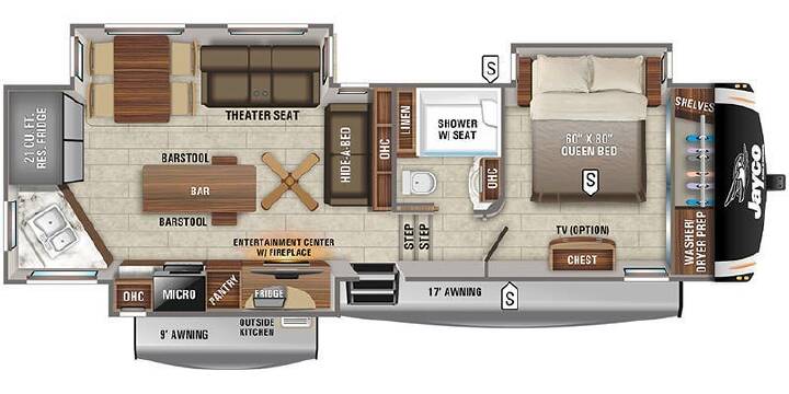 Luxury Package: JAYCOMMAND "Smart RV" System, 2nd "Whisper Quiet" AC Ducted in Bedroom, Drinking Water System , 2nd Power Awning, Washer/Dryer Prep, Soft Close Kitchen Drawers, 21 cu.ft. Residential Refrigerator with 1200w Inverter, LG® Solid-Surface Kitchen Countertop, LED Fireplace, 32" LED Smart TV in Bedroom & Tire Pressure Monitor System (TPMS).