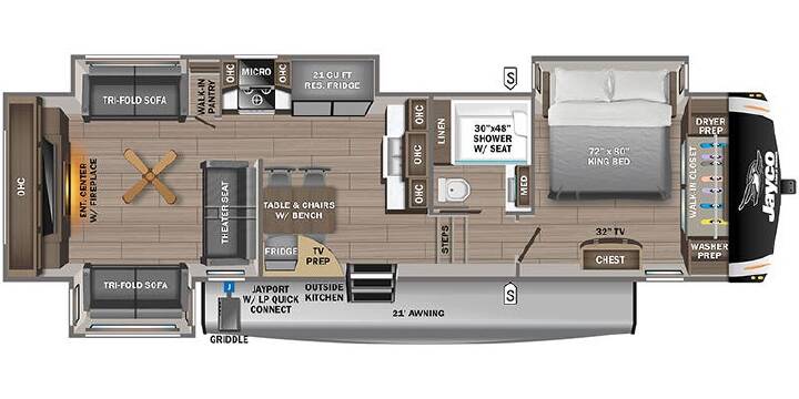 Luxury Package: JAYCOMMAND Pro Tablet System, 2nd "Whisper Quiet" AC Ducted in Bedroom, Drinking Water System , 2nd Power Awning (select models), Washer/Dryer Prep, Residential Refrigerator, Solid-Surface Kitchen Countertop, LED Fireplace, 32" LED Smart TV, King size Bed, Tire Pressure Monitoring System, Black-out Roller Shades