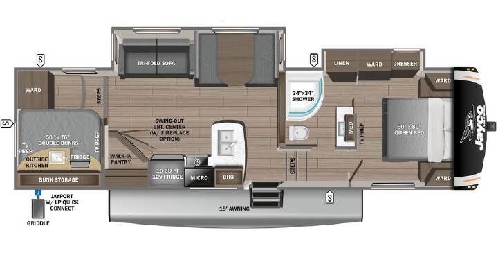 2023 Jayco Eagle HT 29.5BHDS, Not actual photos of #61325. The Jayco Eagle HT 29.5BHDS has a very comfortable and spacious floor plan for the whole family. The Eagle HT 29.5BHDS has a full set of features including: a large outside kitchen with TV hook ups, a spacious living area and bathroom with walk-in shower, a convertible sofa and dinette for additional sleeping, two double bunks with wardrobe and a private queen bed with an amazing amount of wardrobe plus has it's own entrance to the bathroom. This unit is a perfect fit for families with plenty of sleeping, wardrobe and storage space for everybody!
