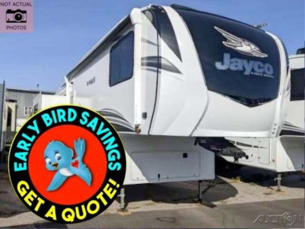 Not actual photos of stock #48547. Its safe to say that the Jayco Eagle HT 31MB is nicer than your average two bedroom apartment. It has theater seating that sits up to four, a large u-dinette, LED fireplace below an expansive flatscreen TV, kitchen island, and double door fridge. If you have company over or just need some time away from your partner, this unit has an additional room with a tri-fold sofa, top bunk, and TV. Jayco Eagle HT 31MB also have a front bedroom with a queen sized bed and outside kitchen.