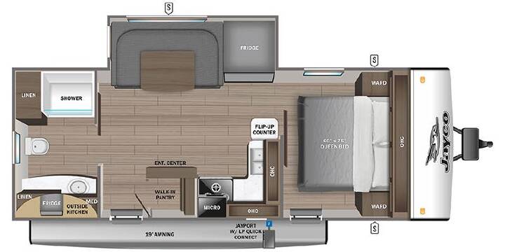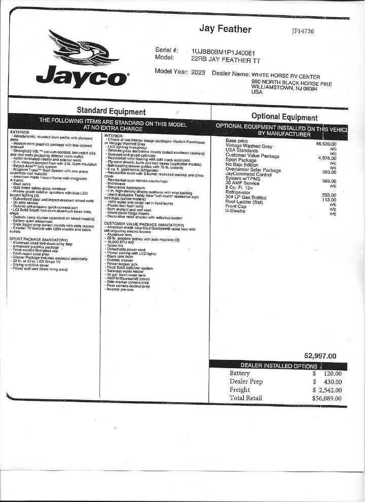 This Stock# JF14736 also has the following factory options included: Overlander Solar Package, JAYCOMMAND "Smart RV" System w/TPMS, 8 Cu. Ft. 12V Refrigerator and 30# LP Gas Bottles (2) ... all backed by Jayco s 2+3 year warranty! MSRP $56,089