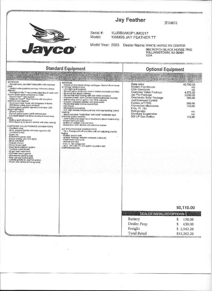 This Stock# JF14851 also has the following factory options included: JAYCOMMAND "Smart RV" System w/TPMS, Overlander Solar Package, Convection Microwave and 30# LP Gas Bottles (2) ... all backed by Jayco s 2+3 year warranty! MSRP $53,202.20.