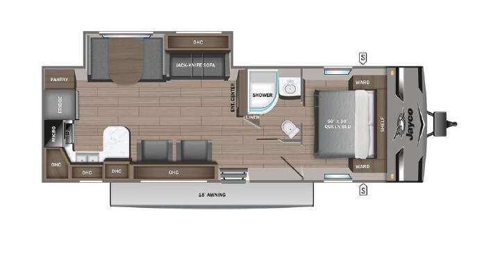 Not actual photos of stock #48517. The Jayco Jay Flight 280RKS is a perfect fit for couples that love to have friends or family tag along. The Jay Flight 280RKS has a front queen bed with wardrobe, a large rear kitchen with more than enough storage, recliners, plus a jack-knife sofa and booth dinette that doubles as extra sleeping space.