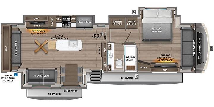 Pinnacle Luxury Package: 6-point Hydraulic Auto-Leveling System, Extreme Weather Pkg, MORryde® StepAbove Entrance Steps (Main Entrance), 2nd Electric Patio Awning w/ Integrated LED Lights, Powered 50 Amp Cord Reel, JAYCOMMAND® "Smart RV" System, Cellular Prep for Antenna and JAYCOMMAND "Smart RV" System, Tire Pressure Monitoring System, High Gloss Gel-Coated Sidewalls, Oversized Multi Battery Compartment (Industry Leading Room for 4-6 Batteries), Exterior 32" 4K Smart LED TV, Hardwood Cabinet Stiles, Central Vacuum System, Day/Night Roller Shades in Living Room, Frameless Dark Tinted SafetyGlass Windows, Freestanding (No Pedestal) Table w/ Leaf, Includes (2) Freestanding Chairs and (2) Folding Chairs, LED Fireplace w/ 5,000 BTU Electric Space Heater, Drinking Water System (Patent-Pending), Residential Refrigerator + 1800W Pure Sine Wave Inverter, 30" Residential Microwave, Residential 24 in. Insignia Stove (3.73 cu. ft. w/ 12K BTU High Output Burner), Residential Solid-Surface Kitchen Countertop w/ Solid Surface Sink Covers, 32" 4K Smart LED TV in bedroom, Residential WalkIn Shower w/ Shampoo/Soap Holder & Teak Seat, Washer/Dryer Prep.
