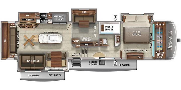 Pinnacle Luxury Package: 6-point Hydraulic Auto-Leveling System, Extreme Weather Pkg, MORryde® StepAbove Entrance Steps (Main Entrance), 2nd Electric Patio Awning w/ Integrated LED Lights, Powered 50 Amp Cord Reel, JAYCOMMAND® "Smart RV" System, Cellular Prep for Antenna and JAYCOMMAND "Smart RV" System, Tire Pressure Monitoring System, High Gloss Gel-Coated Sidewalls, Oversized Multi Battery Compartment (Industry Leading Room for 4-6 Batteries), Exterior 32" 4K Smart LED TV, Hardwood Cabinet Stiles, Central Vacuum System, Day/Night Roller Shades in Living Room, Frameless Dark Tinted SafetyGlass Windows, Freestanding (No Pedestal) Table w/ Leaf, Includes (2) Freestanding Chairs and (2) Folding Chairs, LED Fireplace w/ 5,000 BTU Electric Space Heater, Drinking Water System (Patent-Pending), Residential Refrigerator + 1800W Pure Sine Wave Inverter, 30" Residential Microwave, Residential 24 in. Insignia Stove (3.73 cu. ft. w/ 12K BTU High Output Burner), Residential Solid-Surface Kitchen Countertop w/ Solid Surface Sink Covers, 32" 4K Smart LED TV in bedroom, Residential WalkIn Shower w/ Shampoo/Soap Holder & Teak Seat, Washer/Dryer Prep.