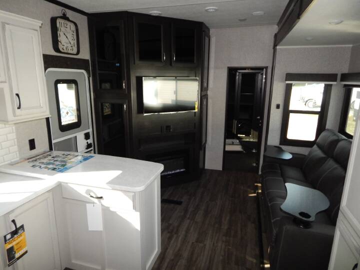 Customer Value Package: Mor-Ryde Strut Assisted Entrance Steps (Main Entrance), (2) 13.5 A/C (Living Room and Bedroom), 50-Amp Service and 3rd A/C Prep, Electric Awning w/ LED Lights, Gas/Electric DSI Water Heater, Residential King (72 in. x 80 in.) Mattress w/Under Bed Storage, Custom Machined Aluminum Rims, 4K LED HDTV w/ Fully Digital HDMI® Ouput, DVD/CD/Bluetooth Stereo, 3 Burner Range w/ Oven, Keyed-Alike Lock System, Rooftop and Ground Solar Prep, Backup Camera Prep, Hidden Hinges on Cabinet Doors, Bathroom Power Vent, Friction Hinge Entrance Door, Night Shades, 10 cu. ft. 12V Refrigerator, Party Deck w/ Folding Rails, Three Seasons Room & Rear Patio Steps