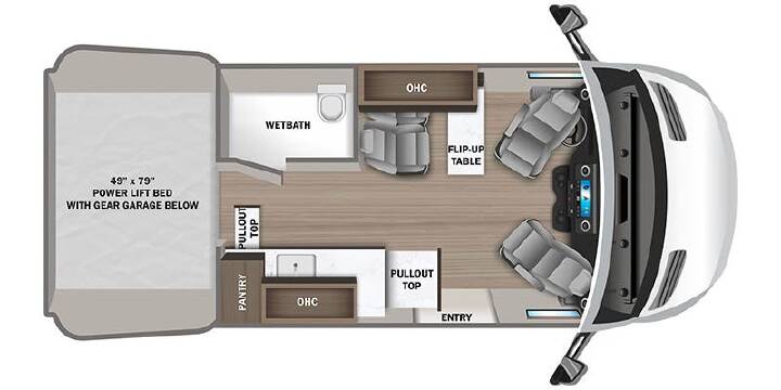 Small but mighty, the Jayco Terrain provides rugged all-terrain handling with luxury amenities when you re parked at your site. Jayco s JRide® ride and handling package makes driving this already easy-to-drive van a dream. Built on the Sprinter 4X4 Premium Mercedes-Benz® chassis, the Terrain features a dual bench seat with two seatbelts and slide and recline features, as well as a rear garage with power drop-down overhead bunk rated at 750 pounds.