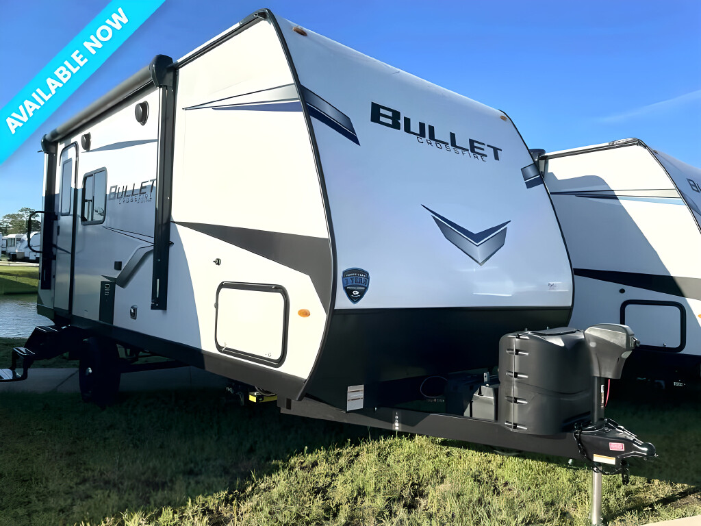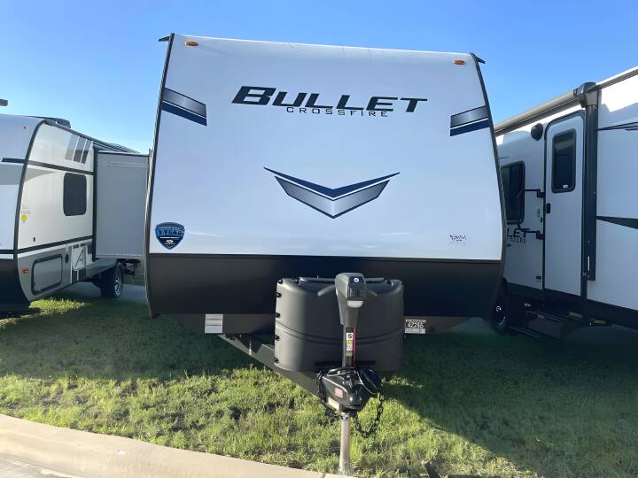 2023 BULLET CROSSFIRE, 1850RB, Travel Trailer, Air Conditioning (BTUs) (13500),Air Conditioning (Standard),Air Conditioning Prewiring (Yes),Air Conditioning Type (Automatic),Awning (Standard),Awning Length (ft) (11),Awning Length (m) (3.4),Bathroom (Standard),Bathroom Flooring Type (Vinyl),Bathroom Location (Rear),Bathroom Medicine Cabinet (Standard),Bathroom Medicine Cabinet Location (Rear),Bathroom Mirror (Standard),Bathroom Mirror Location (Rear),Bathroom Sink (Standard),Bathroom Sink Location (Rear),Bathroom Vent / Fan System (Standard),Bathroom Vent / Fan System Location (Rear),Battery (Standard),Battery Power Converter (Yes),Beds (Standard),Black Water Holding Tank Gauge (Standard),Bluetooth® Audio (Yes),Body Material (Aluminum),Brakes (Standard),CD Player (Standard),Cable Prewiring (Yes),Carbon Monoxide Detector (Standard),Construction (Standard),Curtains / Shades (Standard),DVD Player (Standard),Door Type (Plastic / Glass),Doors (Standard),Emergency Exit(s) (Standard),Exterior Flood Lights (Standard),Exterior Plugs (Standard),Exterior Shower (Standard),Freeze Proof Insulation (Standard),Fresh Water Holding Tank Gauge (Standard),Front Brake Type (Not Applicable),Gray Water Holding Tank Gauge (Standard),Ground Fault Plugs (Standard),Heat Prewiring (Yes),Heater (Standard),Heater Type (Automatic),Hitch Lights (Standard),Interior Decor (Standard),Interior Wood Finish (Yes),Kitchen / Living Area (Standard),Kitchen / Living Area Flooring Type (Carpet / Vinyl),Kitchen Location (Center),Kitchen Table Configuration (None),Layout (Stove),Leveling Jack Type (Front Power / Rear Power),Leveling Jacks (Standard),Living Area Location (Center),Max Sleeping Count (4),Microwave Oven (Standard),Number Of Bathrooms (1),Number Of Convertible / Sofa Beds (1),Number Of Discs (1),Number Of Emergency Exits (1),Number Of Oven Burners (2),Number Of Queen Size Beds (1),Number Of Radios (1),Number Of Sofas (1),Number Of Televisions (1),Number of Awnings (1),Number of Doors (1),Number of Slideouts (1),Oven / Stove (Standard),Overhead Fan (Yes),Paint (Standard),Pass-Thru Storage (Standard),Power Retractable Awning (Yes),Power Retractable Slideout (Yes),Prewiring (Standard),Propane Alarm (Standard),Propane Tank Cover (Standard),Radio (Standard),Rear Brake Type (Electric Drum),Refrigerator (Standard),Refrigerator Power Mode (Electric / Propane),Refrigerator Size (Mid-Size),Retractable Roof Antenna (Standard),Roof Vents (Standard),Satellite Prewiring (Yes),Shower (Standard),Shower Location (Rear),Sidewall Construction (Fiberglass),Sink / Faucet (Standard),Sink Cover / Cutting Boards (Standard),Sky Light (Standard),Slideouts (Standard),Smoke Detector (Standard),Sofa (Standard),Sofa Material (Vinyl),Solar (Yes),Solar Battery Charger (Standard),Speaker Location(s) (Interior / Exterior),Speakers (Standard),TV Antenna Prewiring (Yes),Television (Standard),Toilet (Standard),Toilet Location (Rear),Toilet Type (Plastic),Trailer Level Gauge (Standard),Wallpaper (Yes),Water Heater