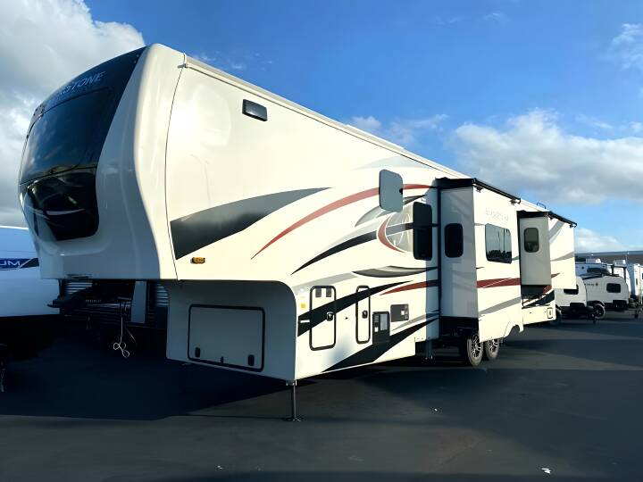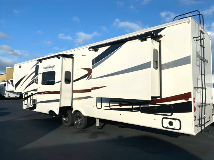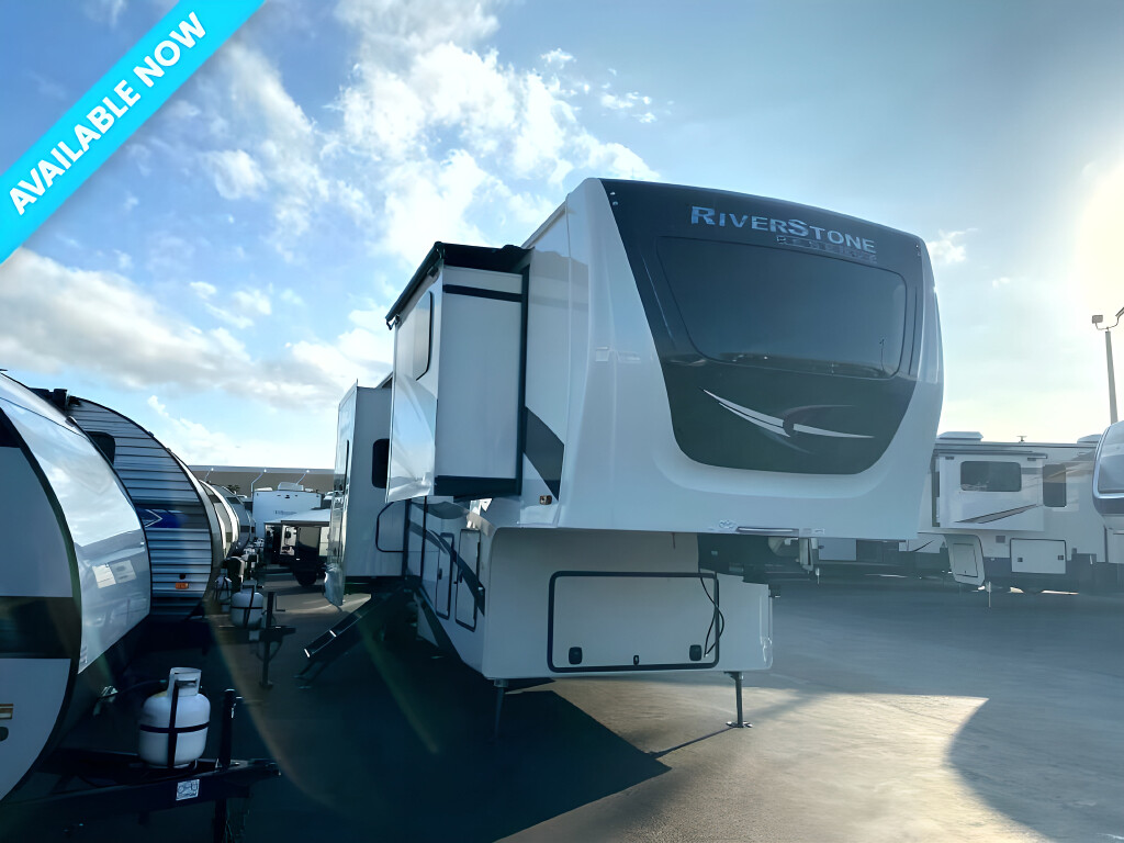 2023 RIVERSTONE RESERVE Riverstone Reserve, 3950FWK, Fifth Wheel, Air Conditioning (BTUs) (30000),Air Conditioning (Standard),Air Conditioning Prewiring (Yes),Air Conditioning Type (Automatic),Awning (Standard),Awning Length (ft) (30),Awning Length (m) (9.1),Back-Up Camera (Yes),Bathroom (Standard),Bathroom Flooring Type (Vinyl),Bathroom Location (Center),Bathroom Medicine Cabinet (Standard),Bathroom Medicine Cabinet Location (Center),Bathroom Mirror (Standard),Bathroom Mirror Location (Center),Bathroom Sink (Standard),Bathroom Sink Location (Center),Bathroom Vent / Fan System (Standard),Bathroom Vent / Fan System Location (Center),Battery (Standard),Battery Power Converter (Yes),Bed Spreads (Standard),Beds (Standard),Black Water Holding Tank Gauge (Standard),Bluetooth® Audio (Yes),Body Material (Aluminum),Brakes (Standard),Brand Name (JBL),CD Player (Standard),Cable Prewiring (Yes),Carbon Monoxide Detector (Standard),Ceiling Fan (Standard),Central Vacuum System (Standard),Construction (Standard),Curtains / Shades (Standard),DVD Player (Standard),Dishwasher (Optional),Door Type (Plastic / Glass),Doors (Standard),Emergency Exit(s) (Standard),Exterior Entertainment System (Optional),Exterior Flood Lights (Standard),Exterior Ladder (Standard),Exterior Plugs (Standard),Exterior Shower (Standard),Fireplace (Standard),Freeze Proof Insulation (Standard),Fresh Water Holding Tank Gauge (Standard),Front Brake Type (Not Applicable),Full Size Master Bedroom Closet (Yes),Generator (Optional),Gray Water Holding Tank Gauge (Standard),Ground Fault Plugs (Standard),Heat Prewiring (Yes),Heater (BTUs) (40000),Heater (Standard),Heater Type (Automatic),Interior Decor (Standard),Interior Wood Finish (Yes),Kitchen / Living Area (Standard),Kitchen / Living Area Flooring Type (Carpet / Vinyl),Kitchen Location (Front),Kitchen Table Configuration (Counter / Island),Layout (Oven / Stove),Leveling Jack Type (Front Power / Rear Power),Leveling Jacks (Standard),Living Area Location (Center),Master Bedroom (Standard),Master Bedroom Door Style (Full Sliding Door),Master Bedroom Flooring Type (Vinyl),Master Bedroom Location (Rear),Master Bedroom Mirror Doors (Yes),Master Bedroom Shades / Curtains (Yes),Material (Cloth),Max Sleeping Count (6),Microwave Oven (Standard),Mobile App Instrumentation (Yes),Number Of Bathrooms (1),Number Of Convertible / Sofa Beds (1),Number Of Discs (1),Number Of Emergency Exits (1),Number Of King Size Beds (1),Number Of Oven Burners (4),Number Of Radios (1),Number Of Recliner / Rockers (2),Number Of Sofas (1),Number Of Televisions (2),Number of Awnings (2),Number of Doors (1),Number of Slideouts (4),Oven / Stove (Standard),Overhead Fan (Yes),Paint (Standard),Pass-Thru Storage (Standard),Power Retractable Awning (Yes),Power Retractable Slideout (Yes),Power Vent Fan (Standard),Prewiring (Standard),Propane Alarm (Standard),Radio (Standard),Rear Brake Type (Electric Drum),Rear Hitch (Standard),Rear Hitch Type (Receiver),Rear Video Backup Camera (Optional)