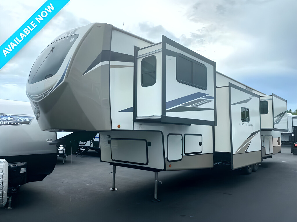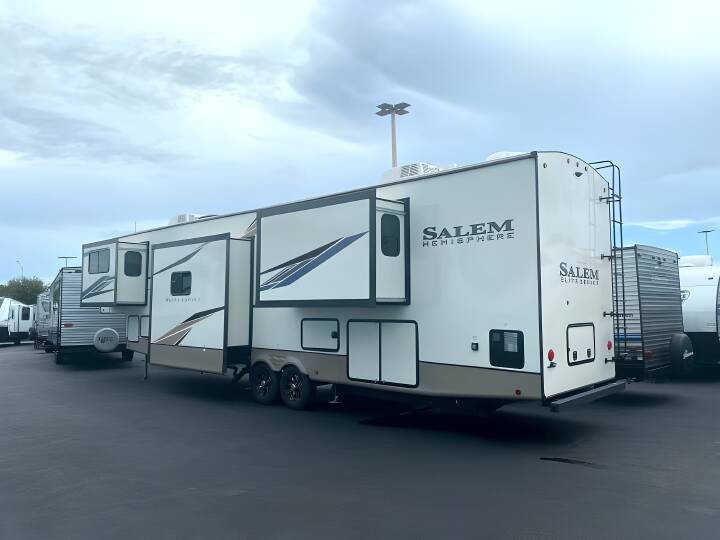 2023 HEMISPHERE ELITE Salem Hemisphere Elite, 36FL, Fifth Wheel, Air Conditioning (BTUs) (15000),Air Conditioning (Standard),Air Conditioning Prewiring (Yes),Air Conditioning Type (Automatic),Awning (Standard),Awning Length (ft) (20),Awning Length (m) (6.1),Back-Up Camera (Yes),Bathroom (Standard),Bathroom Flooring Type (Vinyl),Bathroom Location (Rear / Center),Bathroom Medicine Cabinet (Standard),Bathroom Medicine Cabinet Location (Rear / Center),Bathroom Mirror (Standard),Bathroom Mirror Location (Rear / Center),Bathroom Sink (Standard),Bathroom Sink Location (Rear / Center),Bathroom Vent / Fan System (Standard),Bathroom Vent / Fan System Location (Rear / Center),Battery (Standard),Battery Power Converter (Yes),Bed Spreads (Standard),Beds (Standard),Black Water Holding Tank Gauge (Standard),Bluetooth® Audio (Yes),Body Material (Aluminum),Brakes (Standard),CD Player (Standard),Cable Prewiring (Yes),Carbon Monoxide Detector (Standard),Ceiling Fan (Standard),Construction (Standard),Curtains / Shades (Standard),DVD Player (Standard),Door Type (Plastic / Glass),Doors (Standard),Emergency Exit(s) (Standard),Exterior Entertainment System (Standard),Exterior Flood Lights (Standard),Exterior Kitchen (Standard),Exterior Ladder (Standard),Exterior Plugs (Standard),Exterior Shower (Standard),Fireplace (Standard),Freeze Proof Insulation (Standard),Fresh Water Holding Tank Gauge (Standard),Front Brake Type (Not Applicable),Full Size Master Bedroom Closet (Yes),Gray Water Holding Tank Gauge (Standard),Ground Fault Plugs (Standard),Heat Prewiring (Yes),Heater (BTUs) (30000),Heater (Standard),Heater Type (Automatic),Interior Decor (Standard),Interior Wood Finish (Yes),Kitchen / Living Area (Standard),Kitchen / Living Area Flooring Type (Vinyl),Kitchen Location (Center),Kitchen Table Configuration (Counter / Island),Layout (Oven / Stove),Leveling Jack Type (Front Power / Rear Power),Leveling Jacks (Standard),Living Area Location (Front),Master Bedroom (Standard),Master Bedroom Door Style (Full Sliding Door),Master Bedroom Flooring Type (Vinyl),Master Bedroom Location (Center),Master Bedroom Mirror Doors (Yes),Master Bedroom Shades / Curtains (Yes),Material (Cloth),Max Sleeping Count (6),Microwave Oven (Standard),Number Of Bathrooms (2),Number Of Convertible / Sofa Beds (2),Number Of Discs (1),Number Of Emergency Exits (1),Number Of King Size Beds (1),Number Of Oven Burners (3),Number Of Radios (1),Number Of Recliner / Rockers (2),Number Of Sofas (2),Number Of Televisions (2),Number of Awnings (1),Number of Doors (1),Number of Slideouts (4),Oven / Stove (Standard),Overhead Fan (Yes),Paint (Standard),Pass-Thru Storage (Standard),Power Retractable Awning (Yes),Power Retractable Slideout (Yes),Power Vent Fan (Standard),Prewiring (Standard),Propane Alarm (Standard),Propane Tank Gauge (Standard),Radio (Standard),Rear Brake Type (Electric Drum),Rear Bumper Drain Hose Carrier (Standard),Recliners / Rockers (Standard),Refrigerator (Standard),Refrigerator (Yes),Refrigera