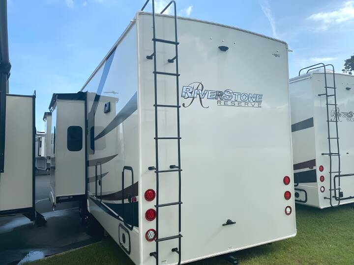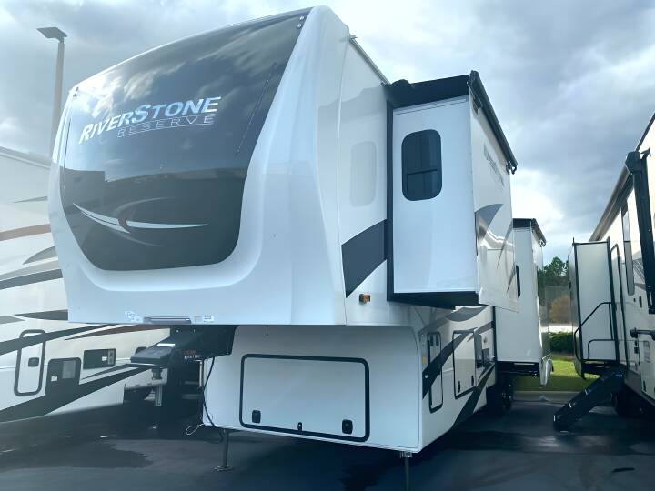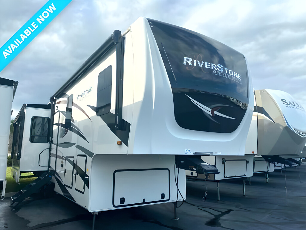 2023 RIVERSTONE RESERVE Riverstone Reserve, 3850RK, Fifth Wheel, Air Conditioning (BTUs) (30000),Air Conditioning (Standard),Air Conditioning Prewiring (Yes),Air Conditioning Type (Automatic),Awning (Standard),Awning Length (ft) (18),Awning Length (m) (5.5),Back-Up Camera (Yes),Bathroom (Standard),Bathroom Flooring Type (Vinyl),Bathroom Location (Center),Bathroom Medicine Cabinet (Standard),Bathroom Medicine Cabinet Location (Center),Bathroom Mirror (Standard),Bathroom Mirror Location (Center),Bathroom Sink (Standard),Bathroom Sink Location (Center),Bathroom Vent / Fan System (Standard),Bathroom Vent / Fan System Location (Center),Battery (Standard),Battery Power Converter (Yes),Bed Spreads (Standard),Beds (Standard),Black Water Holding Tank Gauge (Standard),Bluetooth® Audio (Yes),Body Material (Aluminum),Brakes (Standard),Brand Name (JBL),CD Player (Standard),Cable Prewiring (Yes),Carbon Monoxide Detector (Standard),Ceiling Fan (Standard),Central Vacuum System (Standard),Construction (Standard),Curtains / Shades (Standard),DVD Player (Standard),Dishwasher (Optional),Door Type (Plastic / Glass),Doors (Standard),Emergency Exit(s) (Standard),Exterior Entertainment System (Optional),Exterior Flood Lights (Standard),Exterior Ladder (Standard),Exterior Plugs (Standard),Exterior Shower (Standard),Fireplace (Standard),Freeze Proof Insulation (Standard),Fresh Water Holding Tank Gauge (Standard),Front Brake Type (Not Applicable),Full Size Master Bedroom Closet (Yes),Generator (Optional),Gray Water Holding Tank Gauge (Standard),Ground Fault Plugs (Standard),Heat Prewiring (Yes),Heater (BTUs) (40000),Heater (Standard),Heater Type (Automatic),Interior Decor (Standard),Interior Wood Finish (Yes),Kitchen / Living Area (Standard),Kitchen / Living Area Flooring Type (Carpet / Vinyl),Kitchen Location (Rear),Kitchen Table Configuration (Chairs),Layout (Oven / Stove),Leveling Jack Type (Front Power / Rear Power),Leveling Jacks (Standard),Living Area Location (Center),Master Bedroom (Standard),Master Bedroom Door Style (Full Sliding Door),Master Bedroom Flooring Type (Vinyl),Master Bedroom Location (Front),Master Bedroom Mirror Doors (Yes),Master Bedroom Shades / Curtains (Yes),Material (Cloth),Max Sleeping Count (6),Microwave Oven (Standard),Mobile App Instrumentation (Yes),Number Of Bathrooms (1),Number Of Convertible / Sofa Beds (1),Number Of Discs (1),Number Of Emergency Exits (1),Number Of King Size Beds (1),Number Of Oven Burners (4),Number Of Radios (1),Number Of Recliner / Rockers (2),Number Of Sofas (1),Number Of Televisions (2),Number of Awnings (1),Number of Doors (1),Number of Slideouts (3),Oven / Stove (Standard),Overhead Fan (Yes),Paint (Standard),Pass-Thru Storage (Standard),Power Retractable Awning (Yes),Power Retractable Slideout (Yes),Power Vent Fan (Standard),Prewiring (Standard),Propane Alarm (Standard),Radio (Standard),Rear Brake Type (Electric Drum),Rear Hitch (Standard),Rear Hitch Type (Receiver),Rear Video Backup Camera (Optional),Recliners
