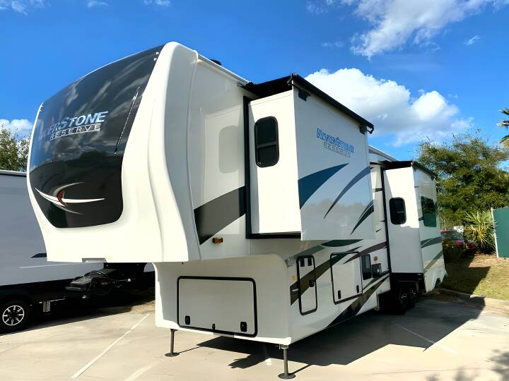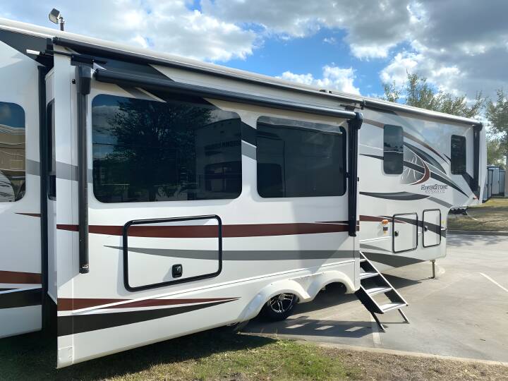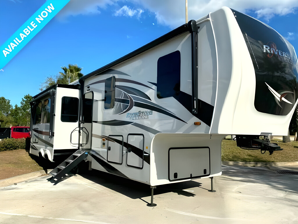2023 RIVERSTONE RESERVE Riverstone Reserve, 3850RK, Fifth Wheel, Air Conditioning (BTUs) (30000),Air Conditioning (Standard),Air Conditioning Prewiring (Yes),Air Conditioning Type (Automatic),Awning (Standard),Awning Length (ft) (18),Awning Length (m) (5.5),Back-Up Camera (Yes),Bathroom (Standard),Bathroom Flooring Type (Vinyl),Bathroom Location (Center),Bathroom Medicine Cabinet (Standard),Bathroom Medicine Cabinet Location (Center),Bathroom Mirror (Standard),Bathroom Mirror Location (Center),Bathroom Sink (Standard),Bathroom Sink Location (Center),Bathroom Vent / Fan System (Standard),Bathroom Vent / Fan System Location (Center),Battery (Standard),Battery Power Converter (Yes),Bed Spreads (Standard),Beds (Standard),Black Water Holding Tank Gauge (Standard),Bluetooth® Audio (Yes),Body Material (Aluminum),Brakes (Standard),Brand Name (JBL),CD Player (Standard),Cable Prewiring (Yes),Carbon Monoxide Detector (Standard),Ceiling Fan (Standard),Central Vacuum System (Standard),Construction (Standard),Curtains / Shades (Standard),DVD Player (Standard),Dishwasher (Optional),Door Type (Plastic / Glass),Doors (Standard),Emergency Exit(s) (Standard),Exterior Entertainment System (Optional),Exterior Flood Lights (Standard),Exterior Ladder (Standard),Exterior Plugs (Standard),Exterior Shower (Standard),Fireplace (Standard),Freeze Proof Insulation (Standard),Fresh Water Holding Tank Gauge (Standard),Front Brake Type (Not Applicable),Full Size Master Bedroom Closet (Yes),Generator (Optional),Gray Water Holding Tank Gauge (Standard),Ground Fault Plugs (Standard),Heat Prewiring (Yes),Heater (BTUs) (40000),Heater (Standard),Heater Type (Automatic),Interior Decor (Standard),Interior Wood Finish (Yes),Kitchen / Living Area (Standard),Kitchen / Living Area Flooring Type (Carpet / Vinyl),Kitchen Location (Rear),Kitchen Table Configuration (Chairs),Layout (Oven / Stove),Leveling Jack Type (Front Power / Rear Power),Leveling Jacks (Standard),Living Area Location (Center),Master Bedroom (Standard),Master Bedroom Door Style (Full Sliding Door),Master Bedroom Flooring Type (Vinyl),Master Bedroom Location (Front),Master Bedroom Mirror Doors (Yes),Master Bedroom Shades / Curtains (Yes),Material (Cloth),Max Sleeping Count (6),Microwave Oven (Standard),Mobile App Instrumentation (Yes),Number Of Bathrooms (1),Number Of Convertible / Sofa Beds (1),Number Of Discs (1),Number Of Emergency Exits (1),Number Of King Size Beds (1),Number Of Oven Burners (4),Number Of Radios (1),Number Of Recliner / Rockers (2),Number Of Sofas (1),Number Of Televisions (2),Number of Awnings (1),Number of Doors (1),Number of Slideouts (3),Oven / Stove (Standard),Overhead Fan (Yes),Paint (Standard),Pass-Thru Storage (Standard),Power Retractable Awning (Yes),Power Retractable Slideout (Yes),Power Vent Fan (Standard),Prewiring (Standard),Propane Alarm (Standard),Radio (Standard),Rear Brake Type (Electric Drum),Rear Hitch (Standard),Rear Hitch Type (Receiver),Rear Video Backup Camera (Optional),Recliners