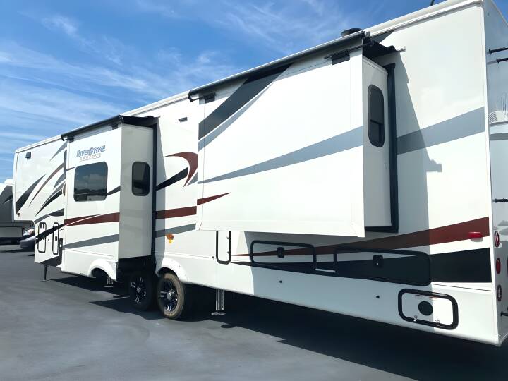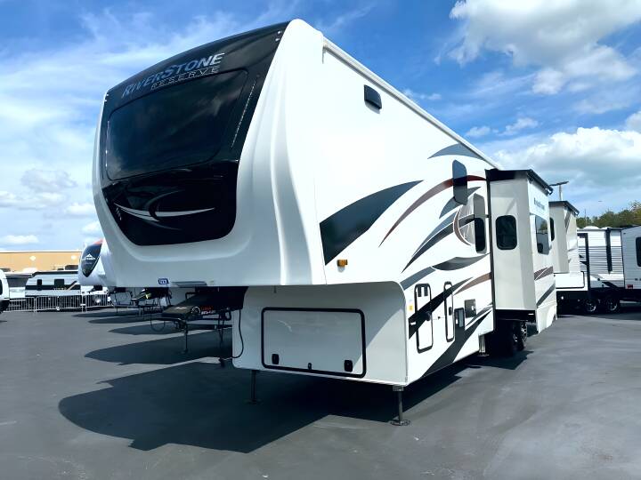 2023 RIVERSTONE RESERVE Riverstone Reserve, 3950FWK, Fifth Wheel, Air Conditioning (BTUs) (30000),Air Conditioning (Standard),Air Conditioning Prewiring (Yes),Air Conditioning Type (Automatic),Awning (Standard),Awning Length (ft) (30),Awning Length (m) (9.1),Back-Up Camera (Yes),Bathroom (Standard),Bathroom Flooring Type (Vinyl),Bathroom Location (Center),Bathroom Medicine Cabinet (Standard),Bathroom Medicine Cabinet Location (Center),Bathroom Mirror (Standard),Bathroom Mirror Location (Center),Bathroom Sink (Standard),Bathroom Sink Location (Center),Bathroom Vent / Fan System (Standard),Bathroom Vent / Fan System Location (Center),Battery (Standard),Battery Power Converter (Yes),Bed Spreads (Standard),Beds (Standard),Black Water Holding Tank Gauge (Standard),Bluetooth® Audio (Yes),Body Material (Aluminum),Brakes (Standard),Brand Name (JBL),CD Player (Standard),Cable Prewiring (Yes),Carbon Monoxide Detector (Standard),Ceiling Fan (Standard),Central Vacuum System (Standard),Construction (Standard),Curtains / Shades (Standard),DVD Player (Standard),Dishwasher (Optional),Door Type (Plastic / Glass),Doors (Standard),Emergency Exit(s) (Standard),Exterior Entertainment System (Optional),Exterior Flood Lights (Standard),Exterior Ladder (Standard),Exterior Plugs (Standard),Exterior Shower (Standard),Fireplace (Standard),Freeze Proof Insulation (Standard),Fresh Water Holding Tank Gauge (Standard),Front Brake Type (Not Applicable),Full Size Master Bedroom Closet (Yes),Generator (Optional),Gray Water Holding Tank Gauge (Standard),Ground Fault Plugs (Standard),Heat Prewiring (Yes),Heater (BTUs) (40000),Heater (Standard),Heater Type (Automatic),Interior Decor (Standard),Interior Wood Finish (Yes),Kitchen / Living Area (Standard),Kitchen / Living Area Flooring Type (Carpet / Vinyl),Kitchen Location (Front),Kitchen Table Configuration (Counter / Island),Layout (Oven / Stove),Leveling Jack Type (Front Power / Rear Power),Leveling Jacks (Standard),Living Area Location (Center),Master Bedroom (Standard),Master Bedroom Door Style (Full Sliding Door),Master Bedroom Flooring Type (Vinyl),Master Bedroom Location (Rear),Master Bedroom Mirror Doors (Yes),Master Bedroom Shades / Curtains (Yes),Material (Cloth),Max Sleeping Count (6),Microwave Oven (Standard),Mobile App Instrumentation (Yes),Number Of Bathrooms (1),Number Of Convertible / Sofa Beds (1),Number Of Discs (1),Number Of Emergency Exits (1),Number Of King Size Beds (1),Number Of Oven Burners (4),Number Of Radios (1),Number Of Recliner / Rockers (2),Number Of Sofas (1),Number Of Televisions (2),Number of Awnings (2),Number of Doors (1),Number of Slideouts (4),Oven / Stove (Standard),Overhead Fan (Yes),Paint (Standard),Pass-Thru Storage (Standard),Power Retractable Awning (Yes),Power Retractable Slideout (Yes),Power Vent Fan (Standard),Prewiring (Standard),Propane Alarm (Standard),Radio (Standard),Rear Brake Type (Electric Drum),Rear Hitch (Standard),Rear Hitch Type (Receiver),Rear Video Backup Camera (Optional)