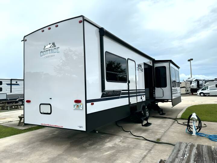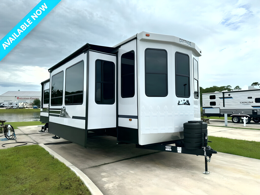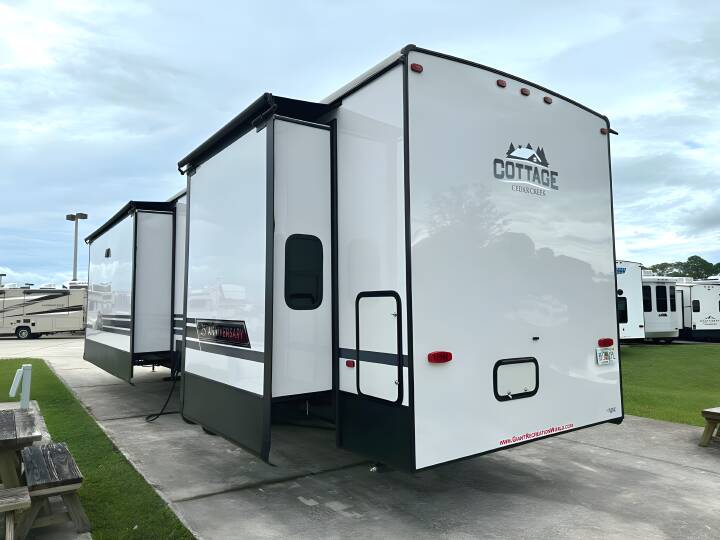 2024 CEDAR CREEK COTTAGE, 40CCK, Travel Trailer, Air Conditioning (BTUs) (30000),Air Conditioning (Standard),Air Conditioning Prewiring (Prewiring) (Yes),Air Conditioning Type (Automatic),Awning (Standard),Awning Length (ft) (18),Awning Length (m) (5.5),Back-Up Camera (Prewiring) (Yes),Bathroom (Standard),Bathroom Flooring Type (Vinyl),Bathroom Location (Center),Bathroom Medicine Cabinet (Standard),Bathroom Medicine Cabinet Location (Center),Bathroom Mirror (Standard),Bathroom Mirror Location (Center),Bathroom Sink (Standard),Bathroom Sink Location (Center),Bathroom Vent / Fan System (Standard),Bathroom Vent / Fan System Location (Center),Battery (Standard),Battery Converter Amps (55),Battery Power Converter (Yes),Bed Spreads (Standard),Beds (Standard),Black Water Holding Tank Gauge (Standard),Bluetooth® Audio (Yes),Body Material (Aluminum),Brakes (Standard),Cable Prewiring (Prewiring) (Yes),Carbon Monoxide Detector (Standard),Ceiling Fan (Standard),Central Vacuum System (Standard),Construction (Standard),Curtains / Shades (Standard),Dishwasher (Optional),Door Type (Plastic / Glass),Doors (Standard),Emergency Exit(s) (Standard),Exterior Flood Lights (Standard),Exterior Plugs (Standard),Fireplace (Standard),Freeze Proof Insulation (Standard),Fresh Water Holding Tank Gauge (Standard),Front Brake Type (Not Applicable),Full Size Master Bedroom Closet (Yes),Gray Water Holding Tank Gauge (Standard),Ground Fault Plugs (Standard),Heat Prewiring (Prewiring) (Yes),Heater (Standard),Heater Type (Automatic),Hitch Lights (Standard),Interior Decor (Standard),Interior Wood Finish (Yes),Kitchen / Living Area (Standard),Kitchen / Living Area Flooring Type (Vinyl),Kitchen Location (Center),Kitchen Table Configuration (Chairs),Layout (Oven / Stove),Leveling Jack Type (Front Manual / Rear Manual),Leveling Jacks (Standard),Living Area Location (Front),Master Bedroom (Standard),Master Bedroom Door Style (Conventional Door),Master Bedroom Flooring Type (Vinyl),Master Bedroom Location (Rear),Master Bedroom Mirror Doors (Yes),Master Bedroom Shades / Curtains (Yes),Material (Vinyl),Max Sleeping Count (4),Microwave Oven (Standard),Mobile App Instrumentation (Yes),Number Of Bathrooms (1),Number Of Convertible / Sofa Beds (1),Number Of Emergency Exits (1),Number Of King Size Beds (1),Number Of Oven Burners (4),Number Of Radios (1),Number Of Recliner / Rockers (2),Number Of Sofas (1),Number Of Televisions (2),Number of Awnings (1),Number of Doors (2),Number of Slideouts (3),Oven / Stove (Standard),Oven Depth (in) (24),Oven Depth (mm) (609.6),Overhead Fan (Yes),Paint (Standard),Power Retractable Awning (Yes),Power Retractable Slideout (Yes),Power Vent Fan (Standard),Prewiring (Prewiring) (Standard),Propane Alarm (Standard),Propane Tank Cover (Standard),Propane Tank Gauge (Standard),Radio (Standard),Rear Brake Type (Hydraulic Drum),Rear Hitch (Standard),Rear Hitch Type (Receiver),Rear Video Backup Camera (Standard),Recliners / Rockers (Standard),Refrigerator (Standard),Refrige