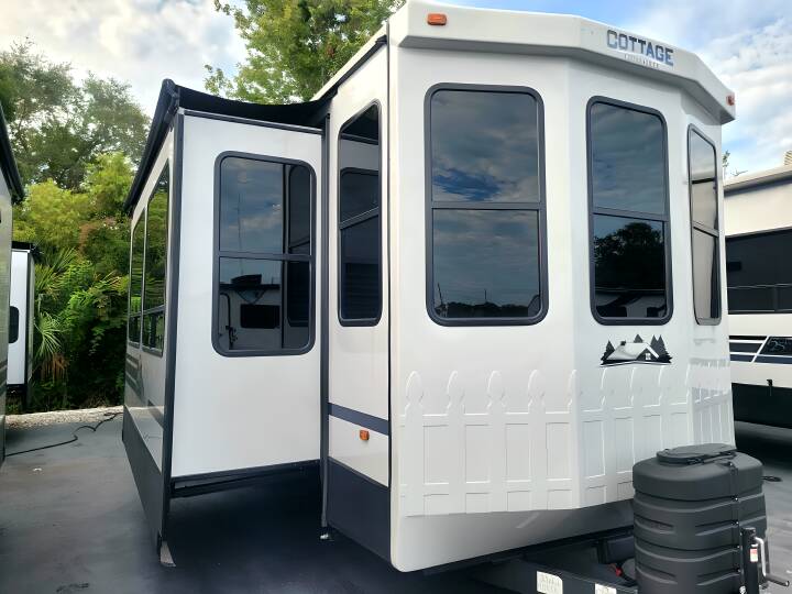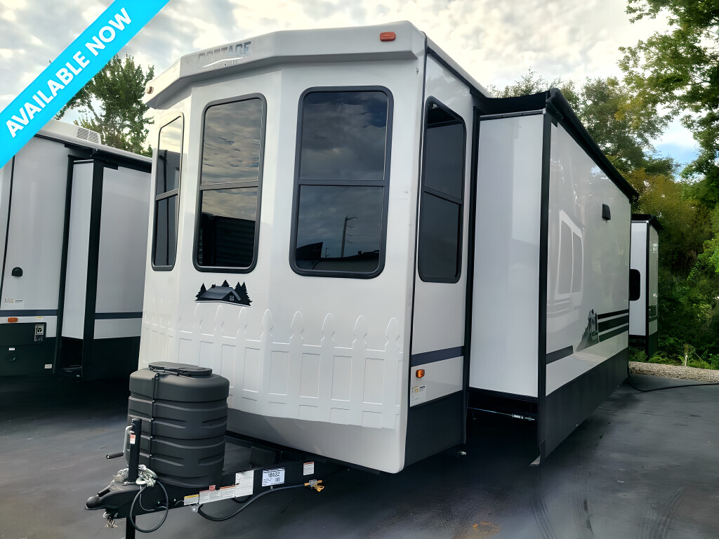 2024 CEDAR CREEK COTTAGE, 40CCK, Travel Trailer, Air Conditioning (BTUs) (30000),Air Conditioning (Standard),Air Conditioning Prewiring (Prewiring) (Yes),Air Conditioning Type (Automatic),Awning (Standard),Awning Length (ft) (18),Awning Length (m) (5.5),Back-Up Camera (Prewiring) (Yes),Bathroom (Standard),Bathroom Flooring Type (Vinyl),Bathroom Location (Center),Bathroom Medicine Cabinet (Standard),Bathroom Medicine Cabinet Location (Center),Bathroom Mirror (Standard),Bathroom Mirror Location (Center),Bathroom Sink (Standard),Bathroom Sink Location (Center),Bathroom Vent / Fan System (Standard),Bathroom Vent / Fan System Location (Center),Battery (Standard),Battery Converter Amps (55),Battery Power Converter (Yes),Bed Spreads (Standard),Beds (Standard),Black Water Holding Tank Gauge (Standard),Bluetooth® Audio (Yes),Body Material (Aluminum),Brakes (Standard),Cable Prewiring (Prewiring) (Yes),Carbon Monoxide Detector (Standard),Ceiling Fan (Standard),Central Vacuum System (Standard),Construction (Standard),Curtains / Shades (Standard),Dishwasher (Optional),Door Type (Plastic / Glass),Doors (Standard),Emergency Exit(s) (Standard),Exterior Flood Lights (Standard),Exterior Plugs (Standard),Fireplace (Standard),Freeze Proof Insulation (Standard),Fresh Water Holding Tank Gauge (Standard),Front Brake Type (Not Applicable),Full Size Master Bedroom Closet (Yes),Gray Water Holding Tank Gauge (Standard),Ground Fault Plugs (Standard),Heat Prewiring (Prewiring) (Yes),Heater (Standard),Heater Type (Automatic),Hitch Lights (Standard),Interior Decor (Standard),Interior Wood Finish (Yes),Kitchen / Living Area (Standard),Kitchen / Living Area Flooring Type (Vinyl),Kitchen Location (Center),Kitchen Table Configuration (Chairs),Layout (Oven / Stove),Leveling Jack Type (Front Manual / Rear Manual),Leveling Jacks (Standard),Living Area Location (Front),Master Bedroom (Standard),Master Bedroom Door Style (Conventional Door),Master Bedroom Flooring Type (Vinyl),Master Bedroom Location (Rear),Master Bedroom Mirror Doors (Yes),Master Bedroom Shades / Curtains (Yes),Material (Vinyl),Max Sleeping Count (4),Microwave Oven (Standard),Mobile App Instrumentation (Yes),Number Of Bathrooms (1),Number Of Convertible / Sofa Beds (1),Number Of Emergency Exits (1),Number Of King Size Beds (1),Number Of Oven Burners (4),Number Of Radios (1),Number Of Recliner / Rockers (2),Number Of Sofas (1),Number Of Televisions (2),Number of Awnings (1),Number of Doors (2),Number of Slideouts (3),Oven / Stove (Standard),Oven Depth (in) (24),Oven Depth (mm) (609.6),Overhead Fan (Yes),Paint (Standard),Power Retractable Awning (Yes),Power Retractable Slideout (Yes),Power Vent Fan (Standard),Prewiring (Prewiring) (Standard),Propane Alarm (Standard),Propane Tank Cover (Standard),Propane Tank Gauge (Standard),Radio (Standard),Rear Brake Type (Hydraulic Drum),Rear Hitch (Standard),Rear Hitch Type (Receiver),Rear Video Backup Camera (Standard),Recliners / Rockers (Standard),Refrigerator (Standard),Refrige