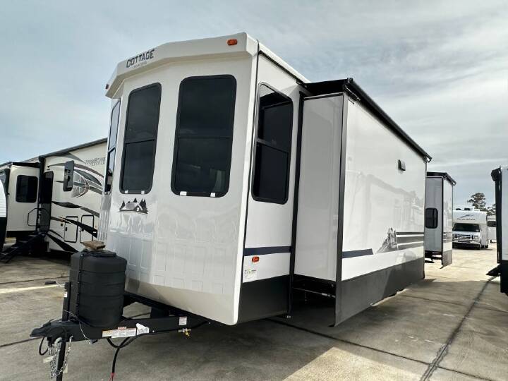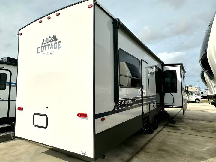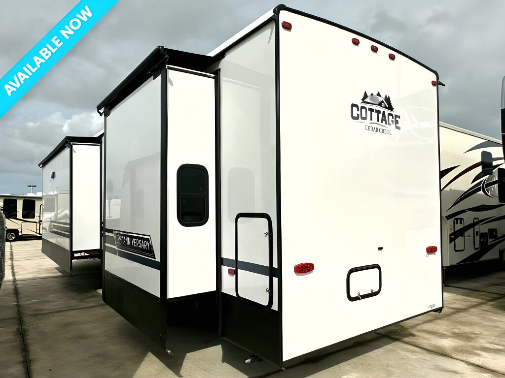 2024 CEDAR CREEK COTTAGE, 40CCK, Travel Trailer, Air Conditioning (BTUs) (30000),Air Conditioning (Standard),Air Conditioning Prewiring (Prewiring) (Yes),Air Conditioning Type (Automatic),Awning (Standard),Awning Length (ft) (18),Awning Length (m) (5.5),Back-Up Camera (Prewiring) (Yes),Bathroom (Standard),Bathroom Flooring Type (Vinyl),Bathroom Location (Center),Bathroom Medicine Cabinet (Standard),Bathroom Medicine Cabinet Location (Center),Bathroom Mirror (Standard),Bathroom Mirror Location (Center),Bathroom Sink (Standard),Bathroom Sink Location (Center),Bathroom Vent / Fan System (Standard),Bathroom Vent / Fan System Location (Center),Battery (Standard),Battery Converter Amps (55),Battery Power Converter (Yes),Bed Spreads (Standard),Beds (Standard),Black Water Holding Tank Gauge (Standard),Bluetooth® Audio (Yes),Body Material (Aluminum),Brakes (Standard),Cable Prewiring (Prewiring) (Yes),Carbon Monoxide Detector (Standard),Ceiling Fan (Standard),Central Vacuum System (Standard),Construction (Standard),Curtains / Shades (Standard),Dishwasher (Optional),Door Type (Plastic / Glass),Doors (Standard),Emergency Exit(s) (Standard),Exterior Flood Lights (Standard),Exterior Plugs (Standard),Fireplace (Standard),Freeze Proof Insulation (Standard),Fresh Water Holding Tank Gauge (Standard),Front Brake Type (Not Applicable),Full Size Master Bedroom Closet (Yes),Gray Water Holding Tank Gauge (Standard),Ground Fault Plugs (Standard),Heat Prewiring (Prewiring) (Yes),Heater (Standard),Heater Type (Automatic),Hitch Lights (Standard),Interior Decor (Standard),Interior Wood Finish (Yes),Kitchen / Living Area (Standard),Kitchen / Living Area Flooring Type (Vinyl),Kitchen Location (Center),Kitchen Table Configuration (Chairs),Layout (Oven / Stove),Leveling Jack Type (Front Manual / Rear Manual),Leveling Jacks (Standard),Living Area Location (Front),Master Bedroom (Standard),Master Bedroom Door Style (Conventional Door),Master Bedroom Flooring Type (Vinyl),Master Bedroom Location (Rear),Master Bedroom Mirror Doors (Yes),Master Bedroom Shades / Curtains (Yes),Material (Vinyl),Max Sleeping Count (4),Microwave Oven (Standard),Mobile App Instrumentation (Yes),Number Of Bathrooms (1),Number Of Convertible / Sofa Beds (1),Number Of Emergency Exits (1),Number Of King Size Beds (1),Number Of Oven Burners (3),Number Of Radios (1),Number Of Recliner / Rockers (2),Number Of Sofas (1),Number Of Televisions (2),Number of Awnings (1),Number of Doors (2),Number of Slideouts (3),Oven / Stove (Standard),Oven Depth (in) (24),Oven Depth (mm) (609.6),Overhead Fan (Yes),Paint (Standard),Power Retractable Awning (Yes),Power Retractable Slideout (Yes),Power Vent Fan (Standard),Prewiring (Prewiring) (Standard),Propane Alarm (Standard),Propane Tank Cover (Standard),Propane Tank Gauge (Standard),Radio (Standard),Rear Brake Type (Hydraulic Drum),Rear Hitch (Standard),Rear Hitch Type (Receiver),Rear Video Backup Camera (Standard),Recliners / Rockers (Standard),Refrigerator (Standard),Refrige