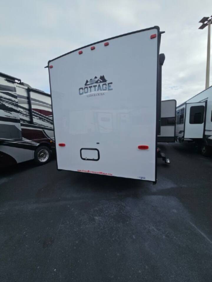 2024 CEDAR CREEK COTTAGE, 40CCK, Travel Trailer, Air Conditioning (BTUs) (30000),Air Conditioning (Standard),Air Conditioning Prewiring (Prewiring) (Yes),Air Conditioning Type (Automatic),Awning (Standard),Awning Length (ft) (18),Awning Length (m) (5.5),Back-Up Camera (Prewiring) (Yes),Bathroom (Standard),Bathroom Flooring Type (Vinyl),Bathroom Location (Center),Bathroom Medicine Cabinet (Standard),Bathroom Medicine Cabinet Location (Center),Bathroom Mirror (Standard),Bathroom Mirror Location (Center),Bathroom Sink (Standard),Bathroom Sink Location (Center),Bathroom Vent / Fan System (Standard),Bathroom Vent / Fan System Location (Center),Battery (Standard),Battery Converter Amps (55),Battery Power Converter (Yes),Bed Spreads (Standard),Beds (Standard),Black Water Holding Tank Gauge (Standard),Bluetooth® Audio (Yes),Body Material (Aluminum),Brakes (Standard),Cable Prewiring (Prewiring) (Yes),Carbon Monoxide Detector (Standard),Ceiling Fan (Standard),Central Vacuum System (Standard),Construction (Standard),Curtains / Shades (Standard),Dishwasher (Optional),Door Type (Plastic / Glass),Doors (Standard),Emergency Exit(s) (Standard),Exterior Flood Lights (Standard),Exterior Plugs (Standard),Fireplace (Standard),Freeze Proof Insulation (Standard),Fresh Water Holding Tank Gauge (Standard),Front Brake Type (Not Applicable),Full Size Master Bedroom Closet (Yes),Gray Water Holding Tank Gauge (Standard),Ground Fault Plugs (Standard),Heat Prewiring (Prewiring) (Yes),Heater (Standard),Heater Type (Automatic),Hitch Lights (Standard),Interior Decor (Standard),Interior Wood Finish (Yes),Kitchen / Living Area (Standard),Kitchen / Living Area Flooring Type (Vinyl),Kitchen Location (Center),Kitchen Table Configuration (Chairs),Layout (Oven / Stove),Leveling Jack Type (Front Manual / Rear Manual),Leveling Jacks (Standard),Living Area Location (Front),Master Bedroom (Standard),Master Bedroom Door Style (Conventional Door),Master Bedroom Flooring Type (Vinyl),Master Bedroom Location (Rear),Master Bedroom Mirror Doors (Yes),Master Bedroom Shades / Curtains (Yes),Material (Vinyl),Max Sleeping Count (4),Microwave Oven (Standard),Mobile App Instrumentation (Yes),Number Of Bathrooms (1),Number Of Convertible / Sofa Beds (1),Number Of Emergency Exits (1),Number Of King Size Beds (1),Number Of Oven Burners (3),Number Of Radios (1),Number Of Recliner / Rockers (2),Number Of Sofas (1),Number Of Televisions (2),Number of Awnings (1),Number of Doors (2),Number of Slideouts (3),Oven / Stove (Standard),Oven Depth (in) (24),Oven Depth (mm) (609.6),Overhead Fan (Yes),Paint (Standard),Power Retractable Awning (Yes),Power Retractable Slideout (Yes),Power Vent Fan (Standard),Prewiring (Prewiring) (Standard),Propane Alarm (Standard),Propane Tank Cover (Standard),Propane Tank Gauge (Standard),Radio (Standard),Rear Brake Type (Hydraulic Drum),Rear Hitch (Standard),Rear Hitch Type (Receiver),Rear Video Backup Camera (Standard),Recliners / Rockers (Standard),Refrigerator (Standard),Refrige