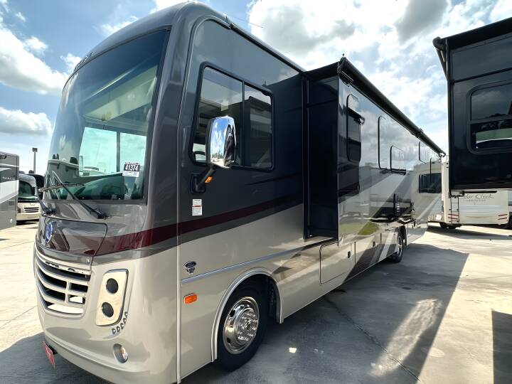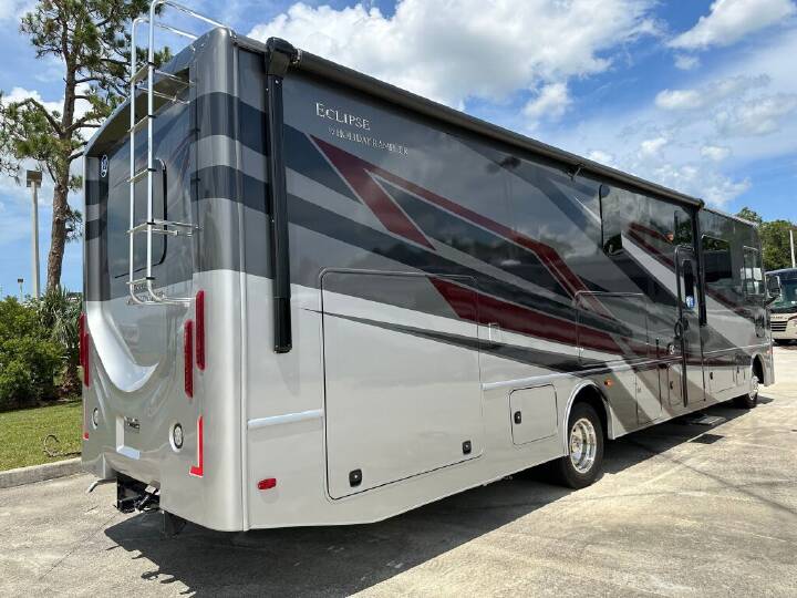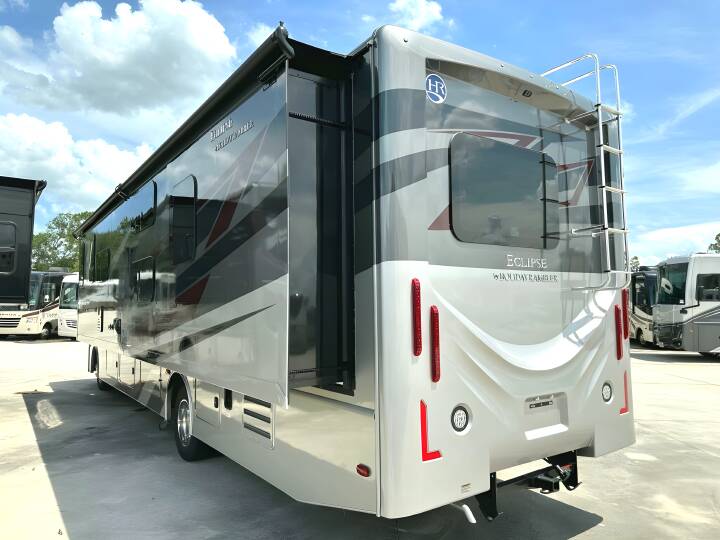 2024 HOLIDAY RAMBLER Eclipse, 34J, Class A Gas, Air Conditioning (BTUs) (27000),Air Conditioning (Standard),Air Conditioning Prewiring (Prewiring) (Yes),Air Conditioning Type (Automatic),Anti-Lock Brakes (Standard),Awning (Standard),Awning Length (ft) (22),Awning Length (m) (6.7),Back-Up Camera (Prewiring) (Yes),Bathroom (Standard),Bathroom Flooring Type (Vinyl),Bathroom Location (Center),Bathroom Medicine Cabinet (Standard),Bathroom Medicine Cabinet Location (Center),Bathroom Mirror (Standard),Bathroom Mirror Location (Center),Bathroom Sink (Standard),Bathroom Sink Location (Center),Bathroom Vent / Fan System (Standard),Bathroom Vent / Fan System Location (Center),Battery (Standard),Battery Converter Amps (55),Battery Power Converter (Yes),Bed Spreads (Standard),Beds (Standard),Black Water Holding Tank Gauge (Standard),Bluetooth® Audio (Yes),Body Material (Aluminum),Brakes (Standard),Bunkhouse (Yes),CD Player (Standard),Cable Prewiring (Prewiring) (Yes),Carbon Monoxide Detector (Standard),Carburetion (Standard),Carburetion Type (Fuel Injected),Chassis Brand (Ford),Chassis Model (F53),Construction (Standard),Cruise Control (Standard),Curtains / Shades (Standard),Cylinders (8),DVD Player (Standard),Displacement (l) (7.3),Door Type (Plastic / Glass),Doors (Standard),Emergency Exit(s) (Standard),Engine (Standard),Engine Type (V8),Exterior Entertainment System (Standard),Exterior Flood Lights (Standard),Exterior Kitchen (Standard),Exterior Ladder (Standard),Exterior Plugs (Standard),Exterior Shower (Standard),Freeze Proof Insulation (Standard),Fresh Water Holding Tank Gauge (Standard),Front Brake Type (Hydraulic Disc),Front Windshield Shade (Standard),Fuel Requirements (Regular),Fuel Type (Gas),Full Size Master Bedroom Closet (Yes),Generator (Standard),Gray Water Holding Tank Gauge (Standard),Ground Fault Plugs (Standard),Heat Prewiring (Prewiring) (Yes),Heater (BTUs) (34000),Heater (Standard),Heater Type (Automatic),Horsepower (bhp) (335),Horsepower (kW) (250),Horsepower RPM (3750),Interior Decor (Standard),Interior Wood Finish (Yes),Kitchen / Living Area (Standard),Kitchen / Living Area Flooring Type (Vinyl),Kitchen Location (Center),Kitchen Table Configuration (Bench Seats),Layout (Oven / Stove),Leveling Jack Type (Front Power / Rear Power),Leveling Jacks (Standard),Living Area Location (Front),Master Bedroom (Standard),Master Bedroom Door Style (Full Sliding Door),Master Bedroom Flooring Type (Vinyl),Master Bedroom Location (Rear),Master Bedroom Mirror Doors (Yes),Master Bedroom Shades / Curtains (Yes),Max Sleeping Count (10),Microwave (Yes),Microwave Oven (Standard),Number Of Bathrooms (1),Number Of Bunk Beds (2),Number Of Convertible / Sofa Beds (2),Number Of Discs (1),Number Of Emergency Exits (1),Number Of King Size Beds (1),Number Of Oven Burners (3),Number Of Queen Size Beds (1),Number Of Radios (1),Number Of Rows (1),Number Of Seats (2),Number Of Sofas (1),Number Of Speeds (6),Number Of Televisions (4),Number of Awnings (1),Number of Door