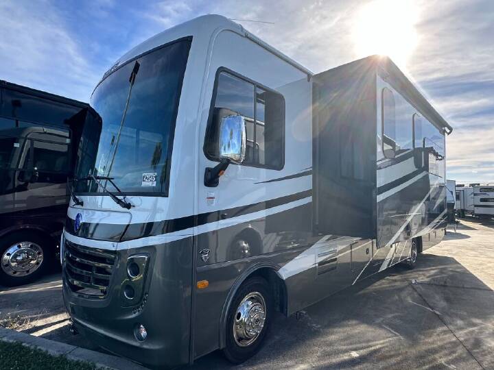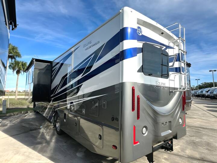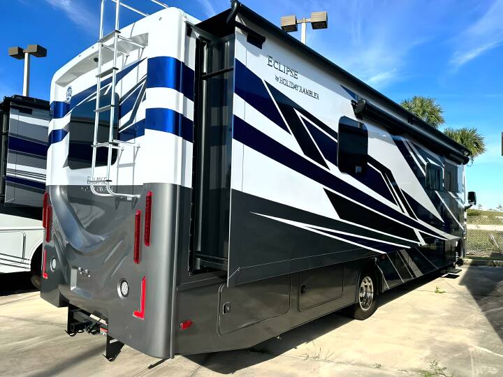 2024 HOLIDAY RAMBLER ECLIPSE, 35R, Class A Gas, Air Conditioning (BTUs) (27000),Air Conditioning (Standard),Air Conditioning Prewiring (Prewiring) (Yes),Air Conditioning Type (Automatic),Anti-Lock Brakes (Standard),Awning (Standard),Awning Length (ft) (18),Awning Length (m) (5.5),Back-Up Camera (Prewiring) (Yes),Bathroom (Standard),Bathroom Flooring Type (Vinyl),Bathroom Location (Center),Bathroom Medicine Cabinet (Standard),Bathroom Medicine Cabinet Location (Center),Bathroom Mirror (Standard),Bathroom Mirror Location (Center),Bathroom Sink (Standard),Bathroom Sink Location (Center),Bathroom Vent / Fan System (Standard),Bathroom Vent / Fan System Location (Center),Battery (Standard),Battery Converter Amps (55),Battery Power Converter (Yes),Bed Spreads (Standard),Beds (Standard),Black Water Holding Tank Gauge (Standard),Bluetooth® Audio (Yes),Body Material (Aluminum),Brakes (Standard),CD Player (Standard),Cable Prewiring (Prewiring) (Yes),Carbon Monoxide Detector (Standard),Carburetion (Standard),Carburetion Type (Fuel Injected),Chassis Brand (Ford),Chassis Model (F53),Construction (Standard),Cruise Control (Standard),Curtains / Shades (Standard),Cylinders (8),DVD Player (Standard),Displacement (l) (7.3),Door Type (Plastic / Glass),Doors (Standard),Emergency Exit(s) (Standard),Engine (Standard),Engine Type (V8),Exterior Entertainment System (Standard),Exterior Flood Lights (Standard),Exterior Ladder (Standard),Exterior Plugs (Standard),Exterior Shower (Standard),Freeze Proof Insulation (Standard),Fresh Water Holding Tank Gauge (Standard),Front Brake Type (Hydraulic Disc),Front Windshield Shade (Standard),Fuel Requirements (Regular),Fuel Type (Gas),Full Size Master Bedroom Closet (Yes),Generator (Standard),Gray Water Holding Tank Gauge (Standard),Ground Fault Plugs (Standard),Heat Prewiring (Prewiring) (Yes),Heater (BTUs) (34000),Heater (Standard),Heater Type (Automatic),Horsepower (bhp) (335),Horsepower (kW) (250),Horsepower RPM (3750),Interior Decor (Standard),Interior Wood Finish (Yes),Kitchen / Living Area (Standard),Kitchen / Living Area Flooring Type (Vinyl),Kitchen Location (Center),Kitchen Table Configuration (Bench Seats),Layout (Oven / Stove),Leveling Jack Type (Front Power / Rear Power),Leveling Jacks (Standard),Living Area Location (Front),Master Bedroom (Standard),Master Bedroom Door Style (Full Sliding Door),Master Bedroom Flooring Type (Vinyl),Master Bedroom Location (Rear),Master Bedroom Mirror Doors (Yes),Master Bedroom Shades / Curtains (Yes),Material (Vinyl),Max Sleeping Count (8),Microwave Oven (Standard),Number Of Bathrooms (1),Number Of Convertible / Sofa Beds (2),Number Of Discs (1),Number Of Emergency Exits (1),Number Of King Size Beds (1),Number Of Oven Burners (3),Number Of Queen Size Beds (1),Number Of Radios (1),Number Of Recliner / Rockers (2),Number Of Rows (1),Number Of Seats (2),Number Of Sofas (1),Number Of Speeds (6),Number Of Televisions (4),Number of Awnings (1),Number of Doors (1),Number of Slideouts (2),Oven
