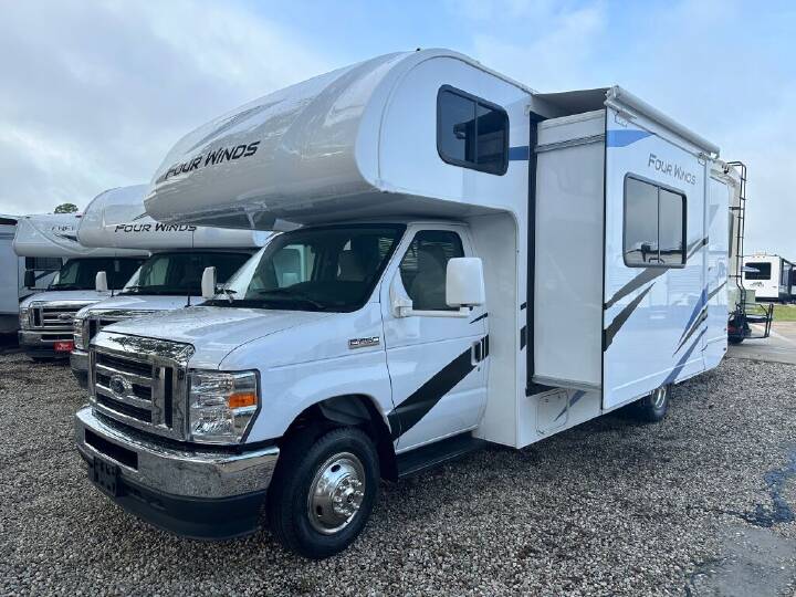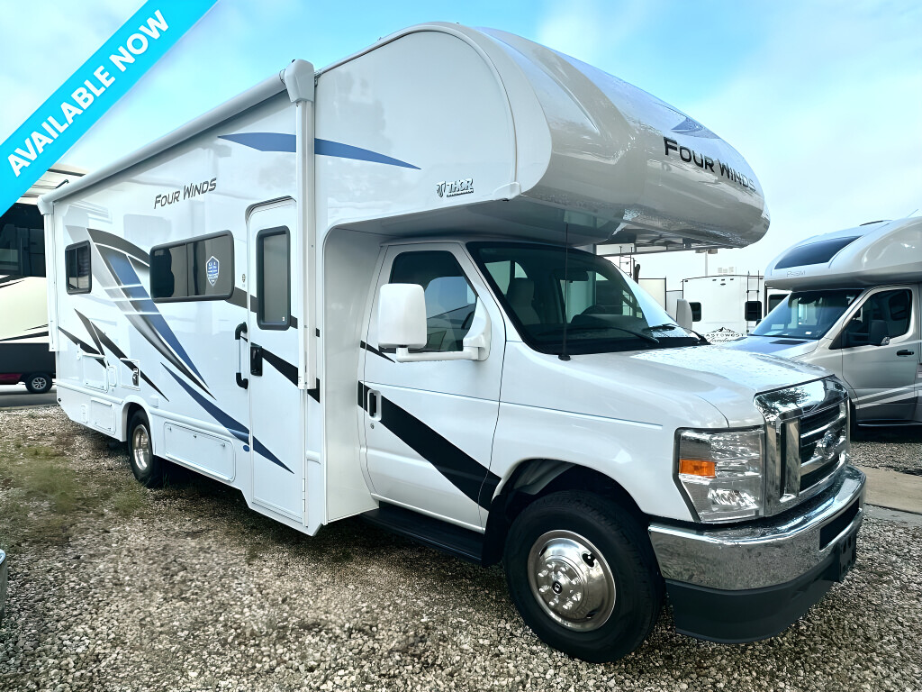 2024 THOR FOUR WINDS, 26X, Class C, Air Conditioning (Standard),Air Conditioning Prewiring (Prewiring) (Yes),Air Conditioning Type (Automatic),Anti-Lock Brakes (Standard),Awning (Standard),Awning Length (ft) (18),Awning Length (m) (5.5),Back-Up Camera (Prewiring) (Yes),Bathroom (Standard),Bathroom Flooring Type (Vinyl),Bathroom Location (Rear),Bathroom Medicine Cabinet (Standard),Bathroom Medicine Cabinet Location (Rear),Bathroom Mirror (Standard),Bathroom Mirror Location (Rear),Bathroom Sink (Standard),Bathroom Sink Location (Rear),Bathroom Vent / Fan System (Standard),Bathroom Vent / Fan System Location (Rear),Battery (Standard),Battery Power Converter (Yes),Bed Spreads (Standard),Beds (Standard),Black Water Holding Tank Gauge (Standard),Body Material (Aluminum),Brakes (Standard),Cable Prewiring (Prewiring) (Yes),Carbon Monoxide Detector (Standard),Carburetion (Standard),Carburetion Type (Fuel Injected),Chassis Brand (Ford),Chassis Model (E450),Construction (Standard),Cruise Control (Standard),Curtains / Shades (Standard),Cylinders (8),Displacement (l) (7.3),Door Type (Plastic / Glass),Doors (Standard),Emergency Exit(s) (Standard),Engine (Standard),Engine Type (V8),Exterior Entertainment System (Optional),Exterior Flood Lights (Standard),Exterior Grille (Optional),Exterior Ladder (Standard),Exterior Plugs (Standard),Exterior Shower (Standard),Freeze Proof Insulation (Optional),Fresh Water Holding Tank Gauge (Standard),Front Brake Type (Hydraulic Disc),Front Windshield Shade (Standard),Fuel Requirements (Regular),Fuel Type (Gas),Generator (Standard),Gray Water Holding Tank Gauge (Standard),Ground Fault Plugs (Standard),Heat Prewiring (Prewiring) (Yes),Heater (BTUs) (30000),Heater (Standard),Heater Type (Automatic),Horsepower (bhp) (325),Horsepower (kW) (242.5),Horsepower RPM (3750),Interior Decor (Standard),Interior Wood Finish (Yes),Kitchen / Living Area (Standard),Kitchen / Living Area Flooring Type (Vinyl),Kitchen Location (Center),Kitchen Table Configuration (None),Layout (Oven / Stove),Leveling Jack Type (Front Manual / Rear Manual),Leveling Jacks (Standard),Living Area Location (Front),Luggage Door (Standard),Max Sleeping Count (6),Microwave Oven (Standard),Number Of Bathrooms (1),Number Of Convertible / Sofa Beds (1),Number Of Emergency Exits (1),Number Of Full Size Beds (1),Number Of Oven Burners (3),Number Of Queen Size Beds (1),Number Of Radios (1),Number Of Rows (1),Number Of Seats (2),Number Of Sofas (1),Number Of Speeds (6),Number Of Televisions (1),Number of Awnings (1),Number of Doors (1),Number of Slideouts (1),Oven / Stove (Standard),Overdrive (Yes),Overhead Fan (Yes),Paint (Standard),Power Retractable Awning (Yes),Power Retractable Slideout (Yes),Power Vent Fan (Standard),Power Windows (Standard),Prewiring (Prewiring) (Standard),Propane Alarm (Standard),Propane Tank Gauge (Standard),Radio (Standard),Rear Brake Type (Hydraulic Disc),Rear Bumper Drain Hose Carrier (Standard),Rear Hitch (Standard),Rear Hitch Type (Receiver),Rear V